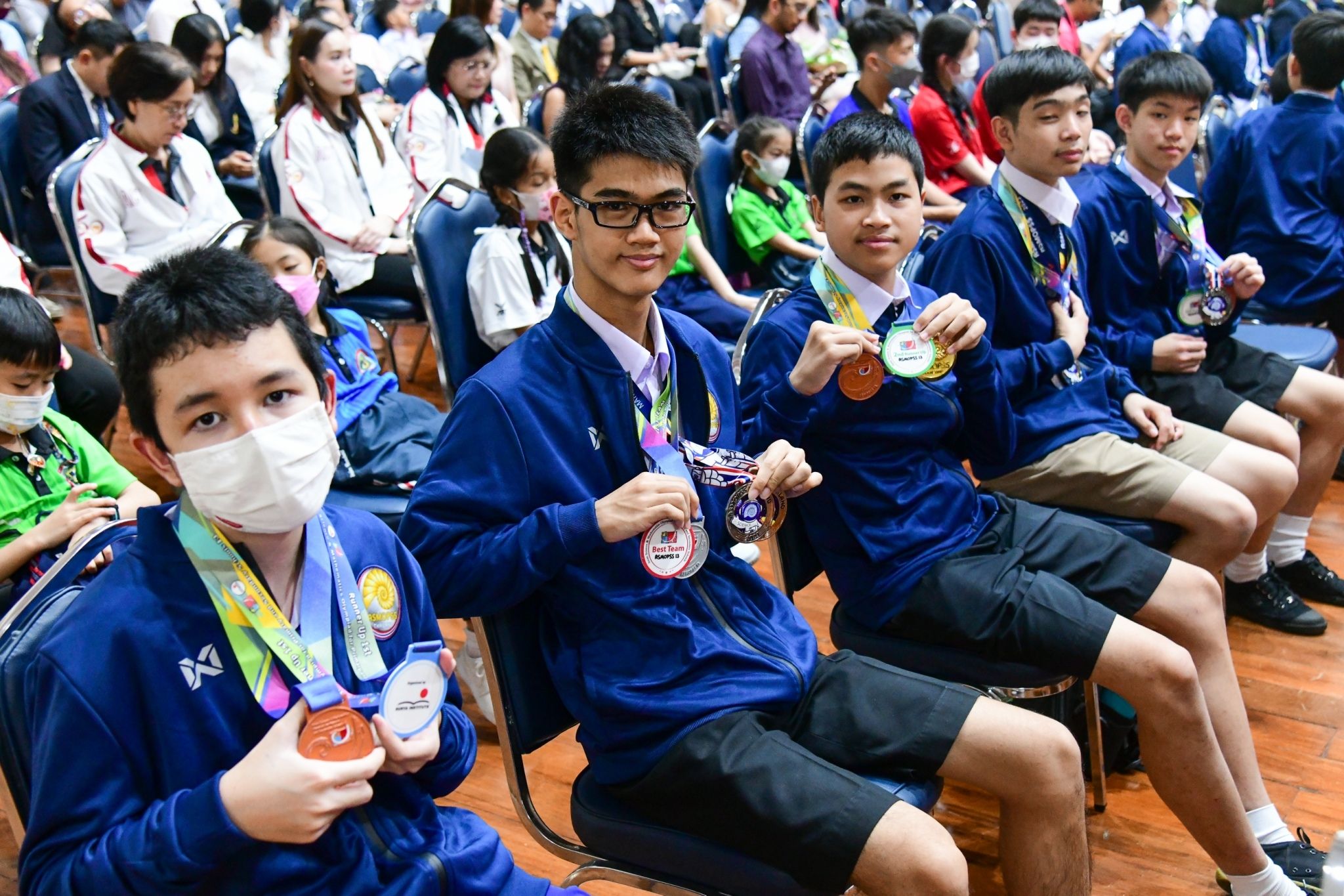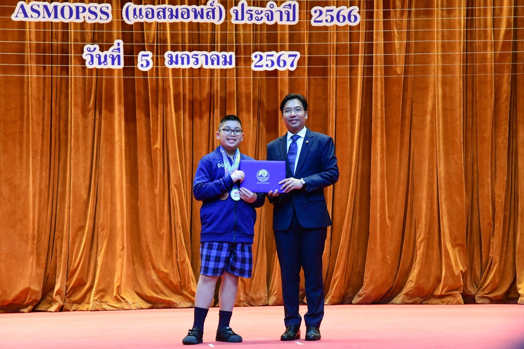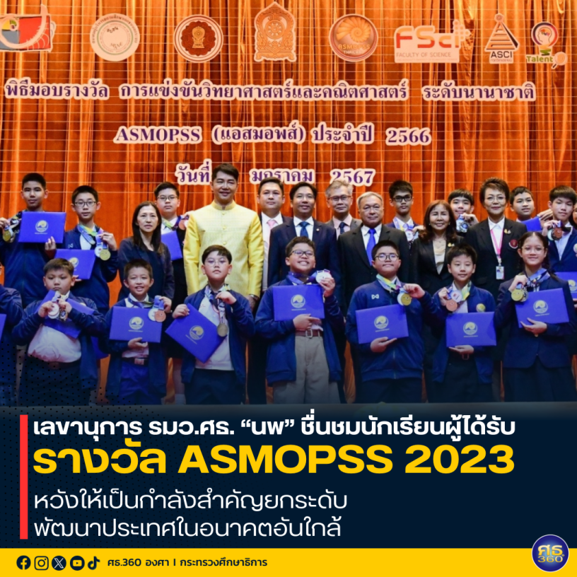 5 มกราคม 2567 / พลตำรวจเอก เพิ่มพูน ชิดชอบ รัฐมนตรีว่าการกระทรวงศึกษาธิการ มอบหมายให้นายนพ ชีวานันท์ เลขานุการรัฐมนตรีว่าการกระทรวงศึกษาธิการ เป็นประธานพิธีมอบรางวัลการแข่งขันวิทยาศาสตร์ – คณิตศาสตร์ระดับนานาชาติ (ASMOPSS 2023) โดยมี พลเรือเอก ทักษิณ ฤกษ์สังเกตุ กรรมการฝ่ายศึกษาสงเคราะห์ มูลนิธิราชประชานุเคราะห์ นางสุมิตรา ทองแสง ผู้เชี่ยวชาญเฉพาะด้านมาตรฐานการศึกษา สช. ผู้บริหารโรงเรียน คณะครู ผู้ปกครอง และนักเรียนผู้รับรางวัล เข้าร่วม ณ ห้องประชุมบุณยเกตุ หอประชุมคุรุสภา