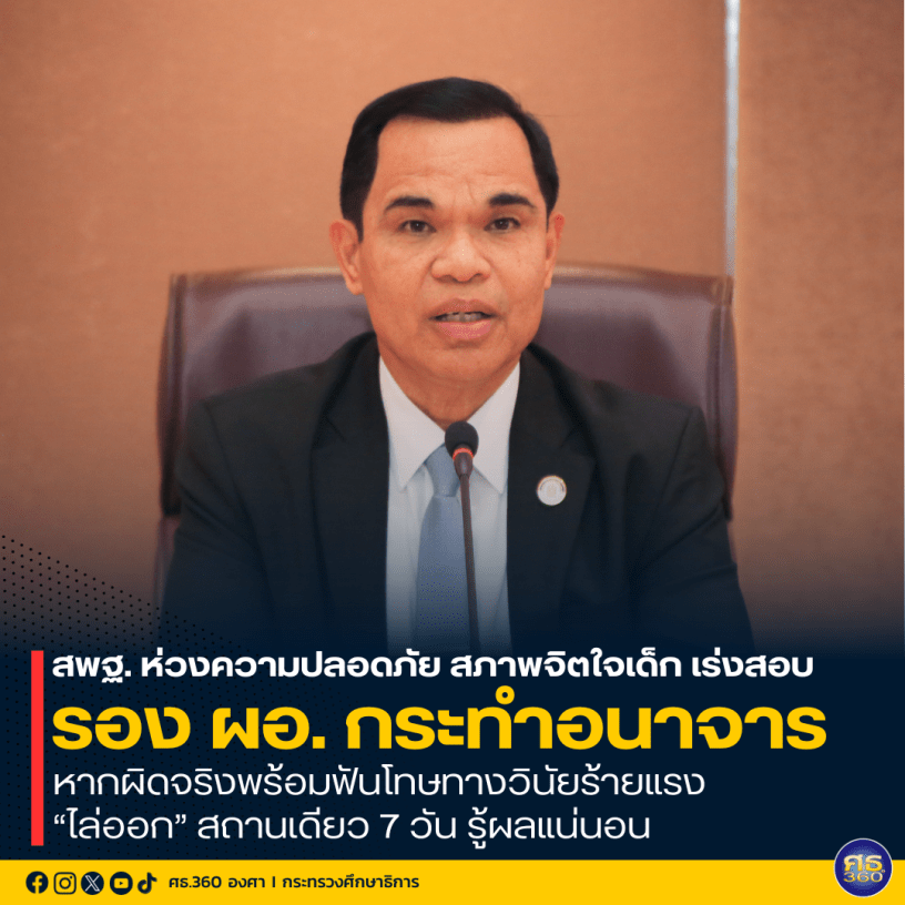 5 มกราคม 2567 – ว่าที่ร้อยตรีธนุ วงษ์จินดา เลขาธิการคณะกรรมการการศึกษาขั้นพื้นฐาน (กพฐ.) เปิดเผยว่า จากกรณีที่มีข่าวรองผู้อำนวยการโรงเรียนราชประชานุเคราะห์ 55 จังหวัดตาก กระทำการเชิงไม่เหมาะสมกับนักเรียนหญิงในโรงเรียน เบื้องต้น สพฐ. ได้รับทราบข้อมูลจากศูนย์ความปลอดภัย สพฐ. และ สำนักบริหารงานการศึกษาพิเศษ (สศศ.) และได้นำเรียนให้ พล.ต.อ.เพิ่มพูน ชิดชอบ รมว.ศธ. และ นายสุรศักดิ์ พันธ์เจริญวรกุล รมช.ศธ. รับทราบแล้ว โดยได้มีข้อสั่งการให้ สพฐ.ดำเนินการเรื่องนี้อย่างรวดเร็ว เพราะถือเป็นเรื่องที่มีความสำคัญอย่างยิ่ง และได้แจ้งแนวปฏิบัติตามนโยบายของ ศธ. กับทุกภาคส่วนเรียบร้อยแล้ว