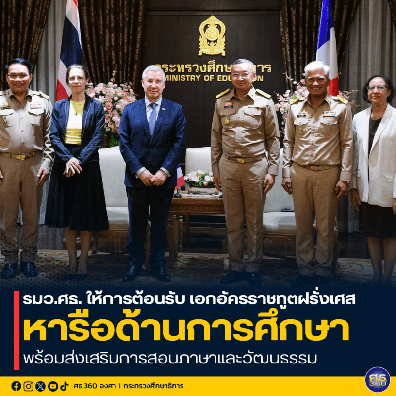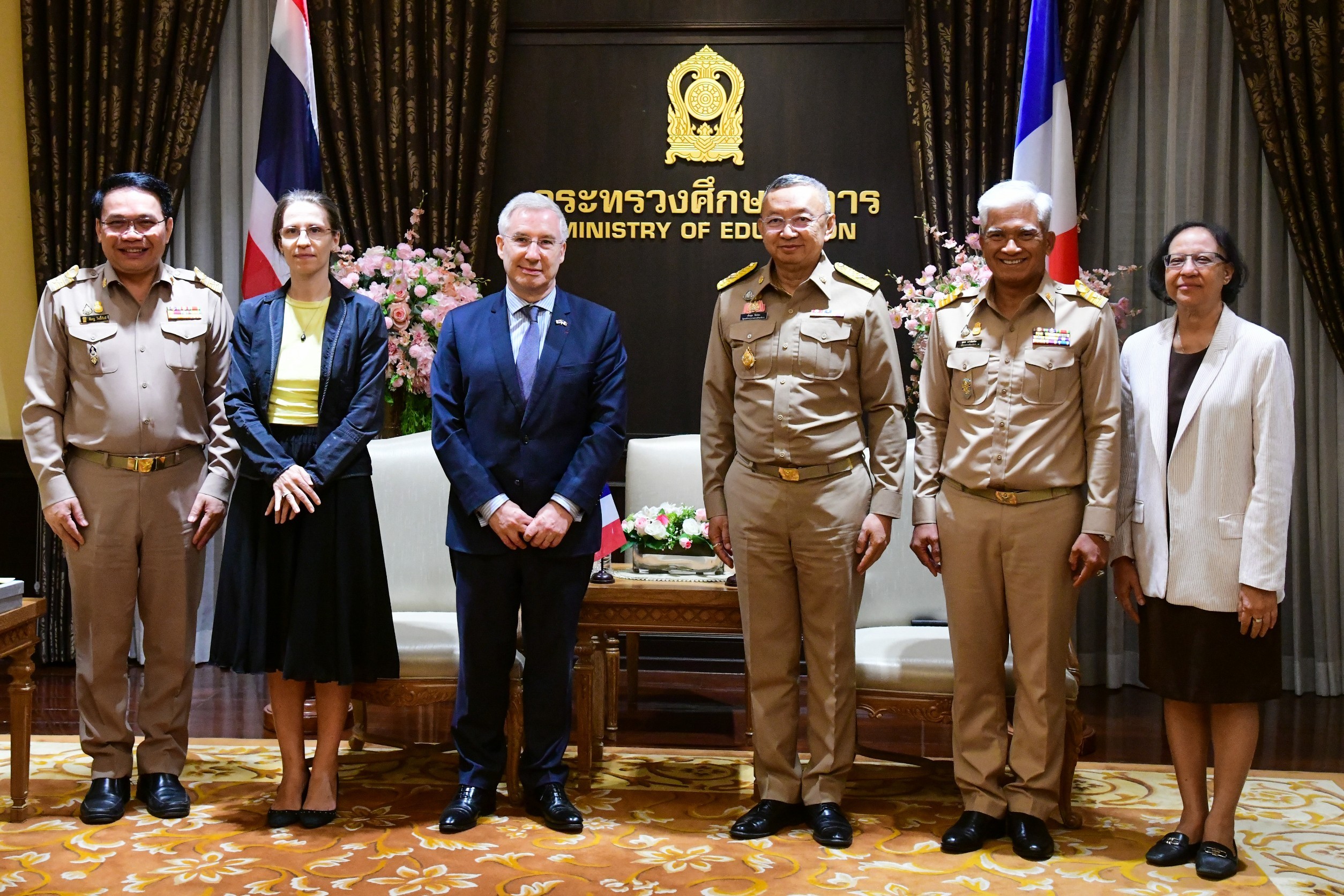 8 มกราคม 2567 – พลตำรวจเอก เพิ่มพูน ชิดชอบ รัฐมนตรีว่าการกระทรวงศึกษาธิการ (รมว.ศธ.) ให้การต้อนรับ นายณ็อง-โกลด ปวงเบิฟ (H.E. Mr. Jean-Claude Poimboeuf) เอกอัครราชทูตสาธารณรัฐฝรั่งเศสประจำประเทศไทย และนางอีฟ ลูแบง (Mrs. Eve Lubin) ที่ปรึกษาความร่วมมือด้านวัฒนธรรม ประจำสถานเอกอัครราชทูตสาธารณรัฐฝรั่งเศสประจำประเทศไทย ในโอกาสเข้าเยี่ยมคารวะและหารือความร่วมมือด้านการศึกษาระหว่างไทยและฝรั่งเศส โดยมี นายสุเทพ แก่งสันเทียะ ปลัด ศธ. นางสาวดุริยา อมตวิวัฒน์ ที่ปรึกษาพิเศษสำนักงาน ศธ. นายพิเชฐ โพธิ์ภักดี รองปลัด ศธ. นายปราโมทย์ ด้วงอิ่ม คณะทำงาน รมว.ศธ. นางพิมพ์วรัชญ์ เมืองนิล รักษาการผู้อำนวยการสำนักความสัมพันธ์ต่างประเทศ และผู้เกี่ยวข้องให้การต้อนรับ ณ ห้องรับรองดำรงราชานุภาพ กระทรวงศึกษาธิการ
