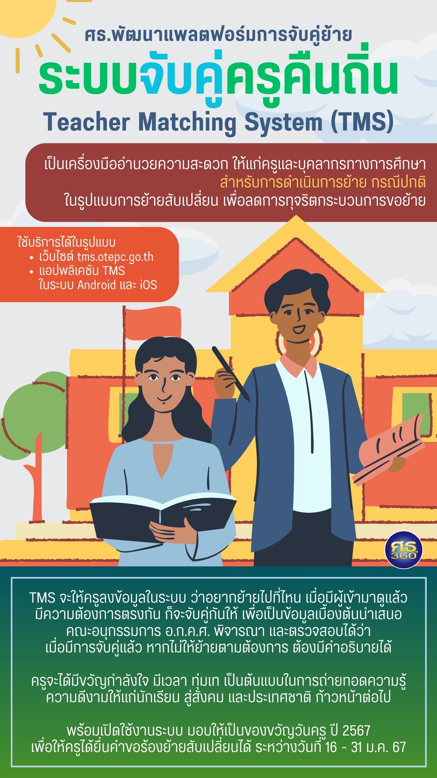 ด้าน รศ.ดร.ประวิต เอราวรรณ์ เลขาธิการ ก.ค.ศ. กล่าวเพิ่มเติมว่า ในระยะเริ่มต้น สำนักงาน ก.ค.ศ. ได้จัดทำระบบจับคู่ครูคืนถิ่น Teacher Matching System (TMS) ซึ่งมีทั้งในรูปแบบออนไลน์ผ่านเว็บไซต์ https://tms.otepc.go.th และแอปพลิเคชัน TMS ซึ่งสามารถดาวน์โหลดได้ทั้ง Android และ iOS เพื่ออำนวยความสะดวกแก่ผู้ใช้งาน โดยผู้ที่ต้องการยื่นขอย้ายสับเปลี่ยนผ่านระบบ TMS จะต้องเข้าไปกรอกข้อมูลส่วนตัว วิชาที่สอน ระบบจะดำเนินการจับคู่กับครูที่มีคุณสมบัติตรงกันที่กรอกข้อมูลเข้ามาในระบบ จึงจะสามารถเข้าสู่กระบวนการย้ายกรณีปกติได้ และในอนาคตจะมีการพัฒนาระบบสำหรับการย้ายทุกกรณีให้อยู่ในรูปแบบออนไลน์ เพื่อให้ครูสามารถใช้งานได้สะดวกมากยิ่งขึ้น โดยจะเปิดใช้งานระบบจับคู่ครูคืนถิ่น Teacher Matching System (TMS) มอบให้เป็นของขวัญวันครู ปี 2567 เพื่อให้ครูได้ยื่นคำขอร้องย้ายสับเปลี่ยนได้ในช่วงระหว่างวันที่ 16 – 31 มกราคม 2567 ที่จะถึงนี้