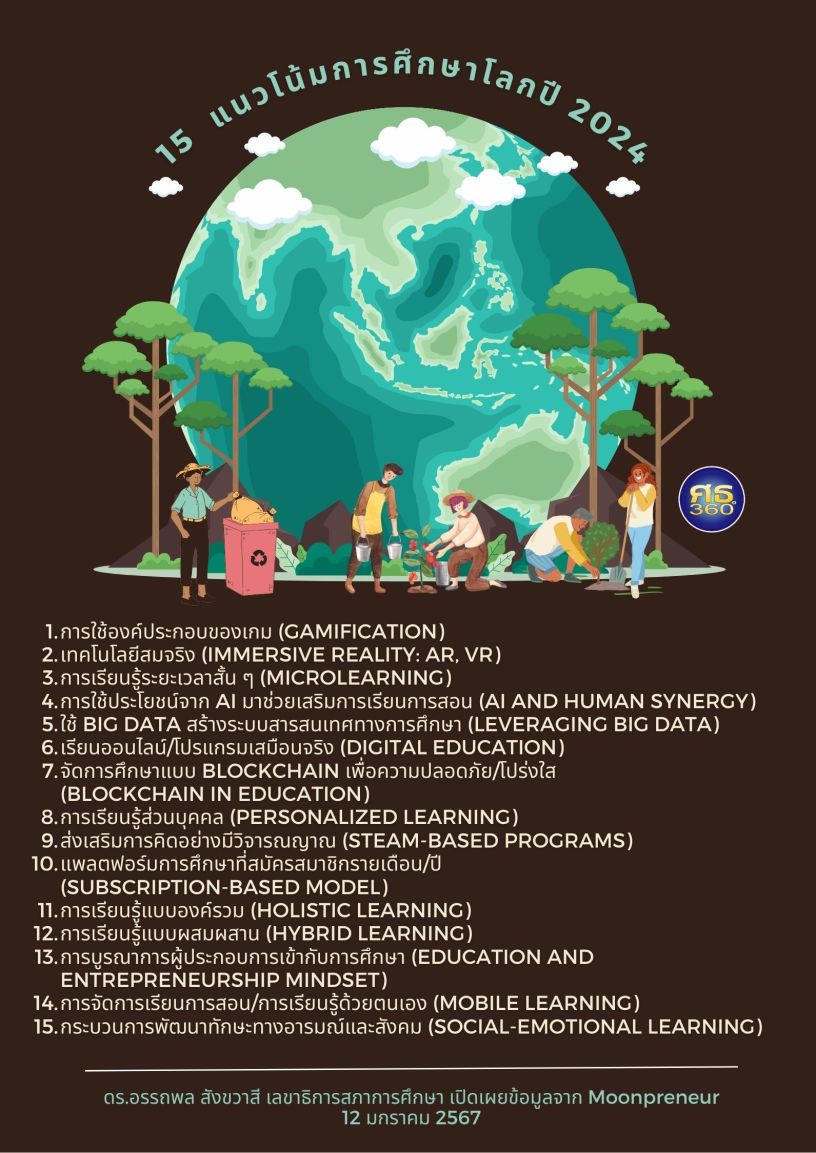 12 มกราคม 2567 – ดร.อรรถพล สังขวาสี เลขาธิการสภาการศึกษา เปิดเผยว่า Moonpreneur ได้มีการเผยแพร่ 15 แนวโน้มการศึกษาโลก ที่จะเกิดขึ้นในปี 2024 ประกอบด้วย