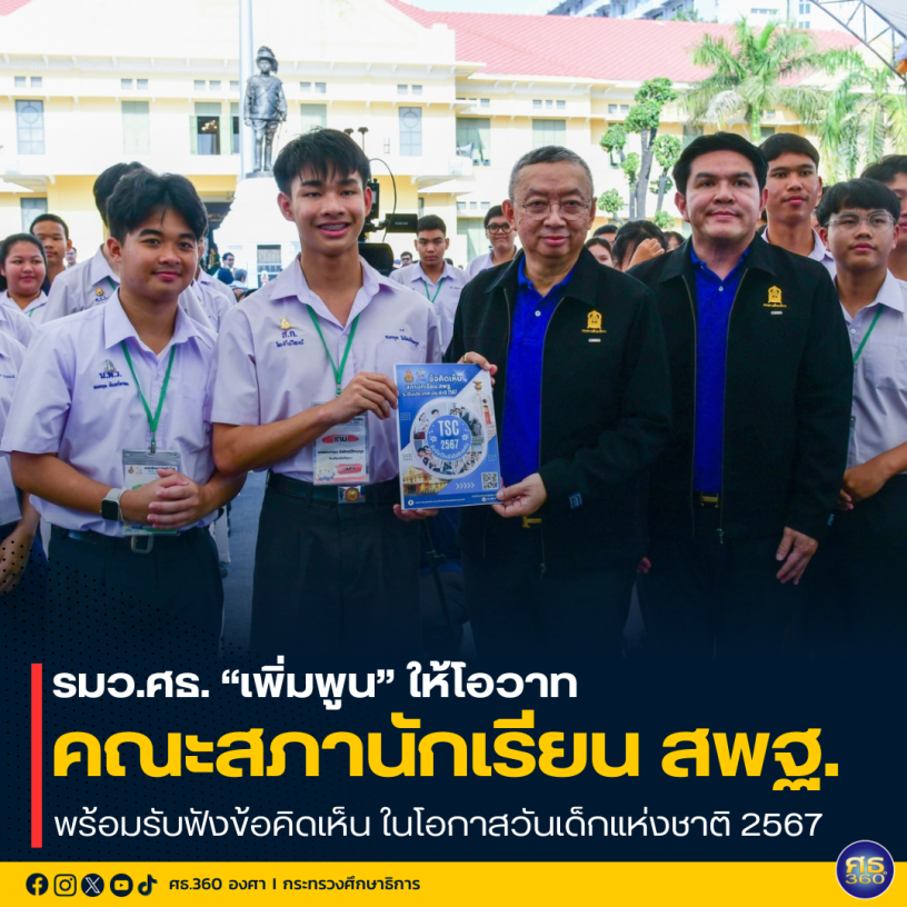 13 มกราคม 2567 / พลตำรวจเอก เพิ่มพูน ชิดชอบ รัฐมนตรีว่าการกระทรวงศึกษาธิการ เปิดโอกาสให้คณะสภานักเรียน โรงเรียนในสังกัดสำนักงานคณะกรรมการการศึกษาขั้นพื้นฐาน (สพฐ.) ซึ่งเป็นตัวแทนสภานักเรียนจากทุกจังหวัดทั่วประเทศ ผู้บริหารสถานศึกษา ครูที่ปรึกษาและคณะทำงานกว่า 200 คน เข้าเยี่ยมคารวะรับโอวาท พร้อมนำเสนอข้อคิดเห็นจากแนวความคิดของเด็กในขอบเขตของกฎ กติกา ที่สามารถปฏิบัติได้ จากการร่วมแลกเปลี่ยนเรียนรู้ สัมมนาสภานักเรียนระดับประเทศ ประจำปี 2567 พร้อมด้วยนายสุรศักดิ์ พันธ์เจริญวรกุล รัฐมนตรีช่วยว่าการกระทรวงศึกษาธิการ โดยมีผู้บริหารฝ่ายการเมือง องค์กรหลัก หน่วยงานในกำกับ เข้าร่วม ณ เวทีกลางหน้าอาคารราชวัลลภ