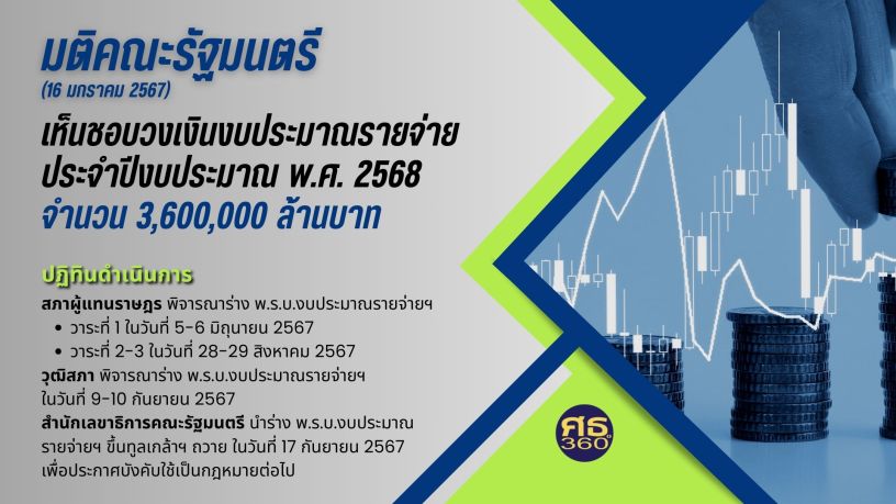 มติคณะรัฐมนตรี (16 มกราคม 2567) มีมติเห็นชอบวงเงินงบประมาณรายจ่ายประจำปีงบประมาณ พ.ศ. 2568 จำนวน 3,600,000 ล้านบาท