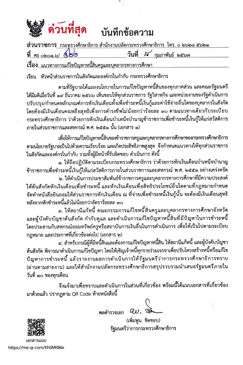 12 กุมภาพันธ์ 2567 / พล.ต.อ.เพิ่มพูน ชิดชอบ รัฐมนตรีว่าการกระทรวงศึกษาธิการ ลงนามในหนังสือด่วนที่สุด ถึงหัวหน้าส่วนราชการในสังกัดและองค์กรในกำกับ กระทรวงศึกษาธิการ เรื่อง แนวทางการแก้ไขปัญหาหนี้สินครูและบุคลากรทางการศึกษา โดยมีสาระสำคัญ คือ ตามที่รัฐบาลได้แถลงนโยบายในการแก้ไขปัญหาหนี้สินของทุกภาคส่วน และคณะรัฐมนตรีได้มีมติเมื่อวันที่ 19 ธันวาคม 2566 เห็นชอบให้ทุกส่วนราชการ รัฐวิสาหกิจ และหน่วยงานของรัฐดำเนินการปรับปรุง/กำหนดหลักเกณฑ์การหักเงินเดือนทั้งเพื่อชำระหนี้เงินกู้และค่าใช้จ่ายอื่นใดของบุคลากรในสังกัด โดยต้องมีเงินเดือนคงเหลือสุทธิเพื่อการดำรงชีพไม่น้อยกว่าร้อยละ 30 ตามแนวทางเดียวกับระเบียบกระทรวงศึกษาธิการ ว่าด้วยการหักเงินเดือนบำเหน็จบำนาญข้าราชการเพื่อชำระหนี้เงินกู้ให้แก่สวัสดิการภายในส่วนราชการและสหกรณ์ พ.ศ. 2551
