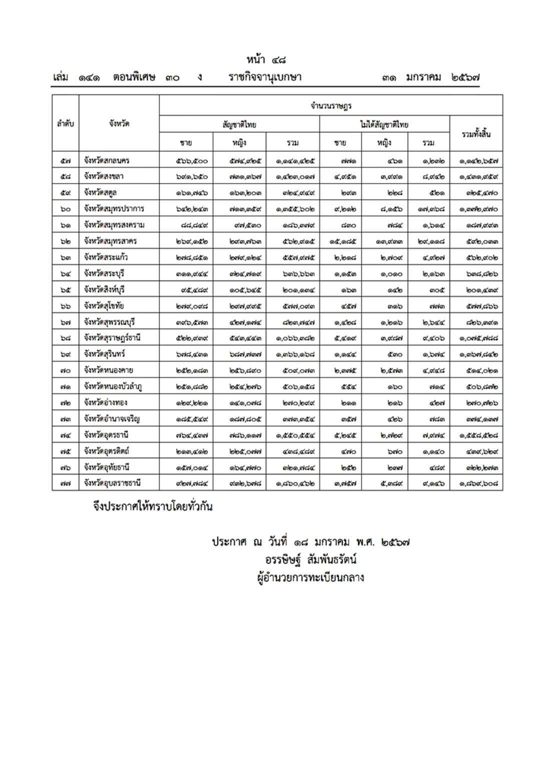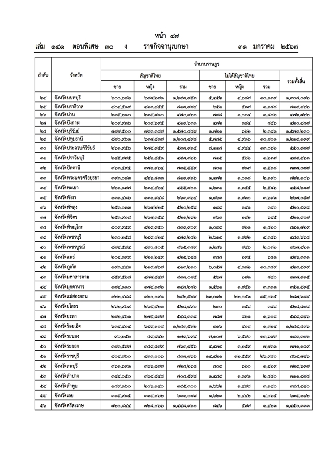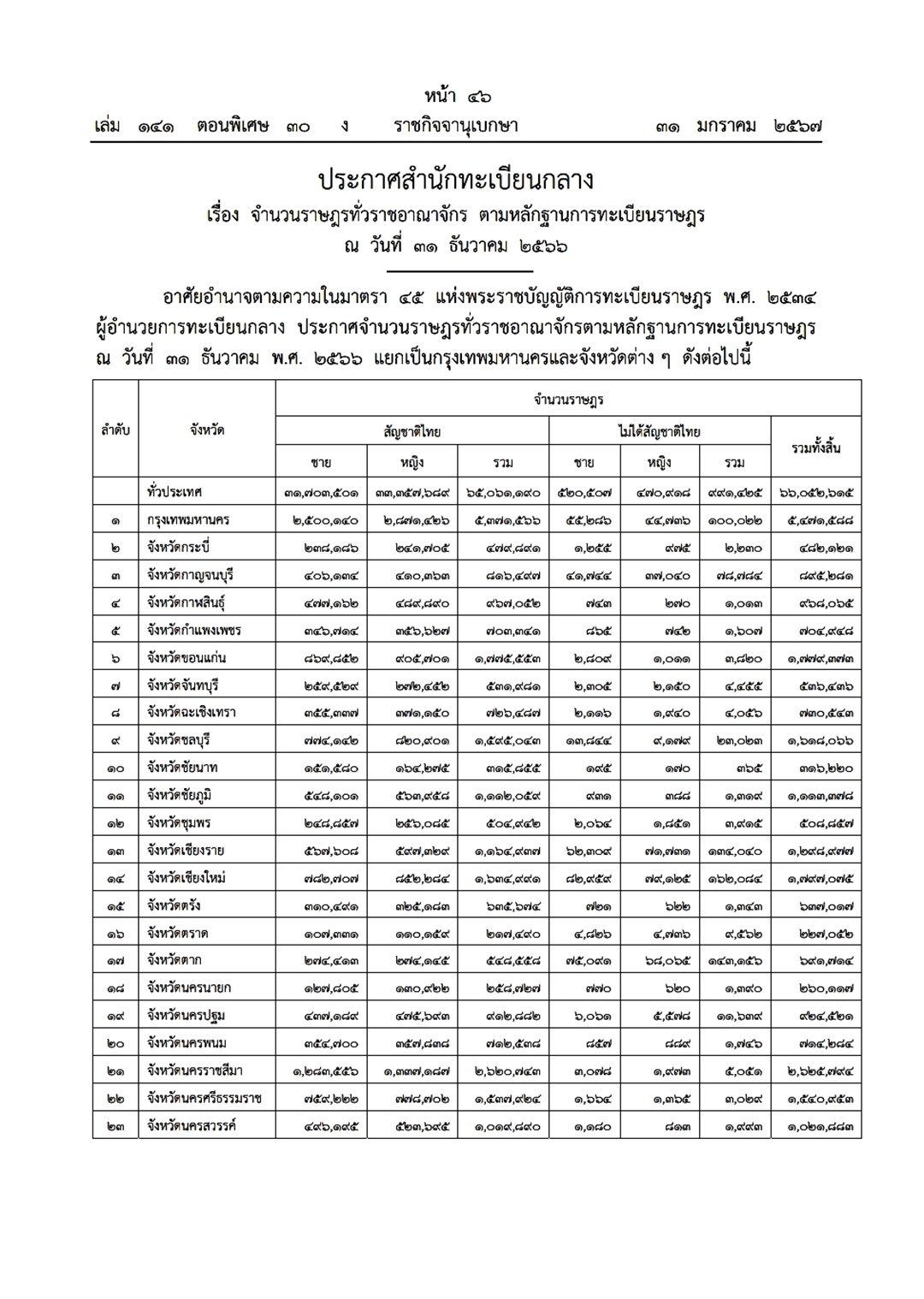 ราชกิจจานุเบกษา (31 มกราคม 2567) เผยแพร่ประกาศสำนักทะเบียนกลาง เรื่อง จำนวนราษฎรทั่วราชอาณาจักร ตามหลักฐานการทะเบียนราษฎร ณ วันที่ 31 ธันวาคม 2566