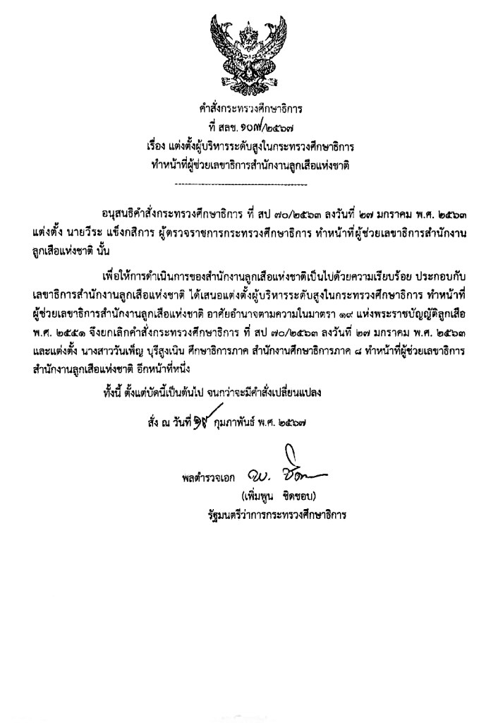 ก่อนหน้านี้ มีคำสั่งกระทรวงศึกษาธิการ ที่ สลช. 107/2567 เรื่อง แต่งตั้งผู้บริหารระดับสูงในกระทรวงศึกษาธิการ ทำหน้าที่ผู้ช่วยเลขาธิการสำนักงานลูกเสือแห่งชาติ โดยแต่งตั้ง นางสาววันเพ็ญ บุรีสูงเนิน ศึกษาธิการภาค สำนักงานศึกษาธิการภาค 8 รักษาการในตำแหน่งผู้ตรวจราชการกระทรวงศึกษาธิการ ทำหน้าที่ผู้ช่วยเลขาธิการสำนักงานลูกเสือแห่งชาติ อีกหน้าที่หนึ่ง