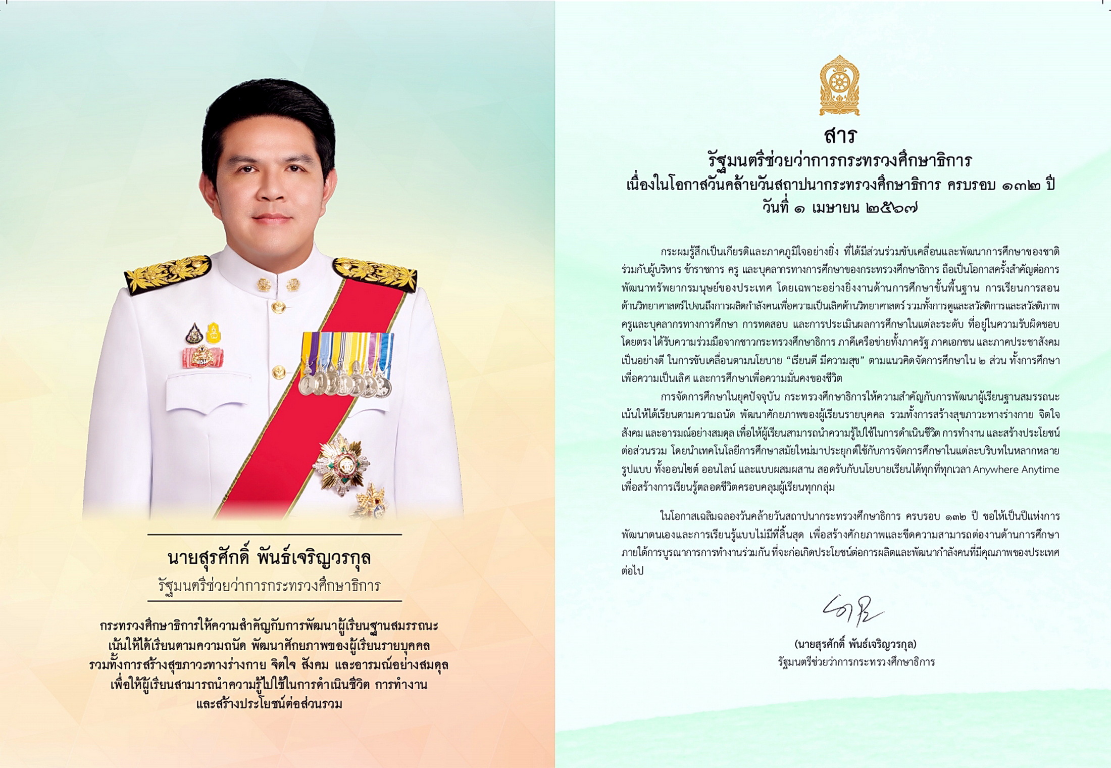 ในโอกาสเฉลิมฉลองวันคล้ายวันสถาปนากระทรวงศึกษาธิการ ครบรอบ 132 ปี ขอให้เป็นปีแห่งการพัฒนาตนเองและการเรียนรู้แบบไม่มีที่สิ้นสุด เพื่อสร้างศักยภาพและขีดความสามารถต่องานด้านการศึกษาภายใต้การบูรณาการการทํางานร่วมกัน ที่จะก่อเกิดประโยชน์ต่อการผลิตและพัฒนากําลังคนที่มีคุณภาพของประเทศต่อไป