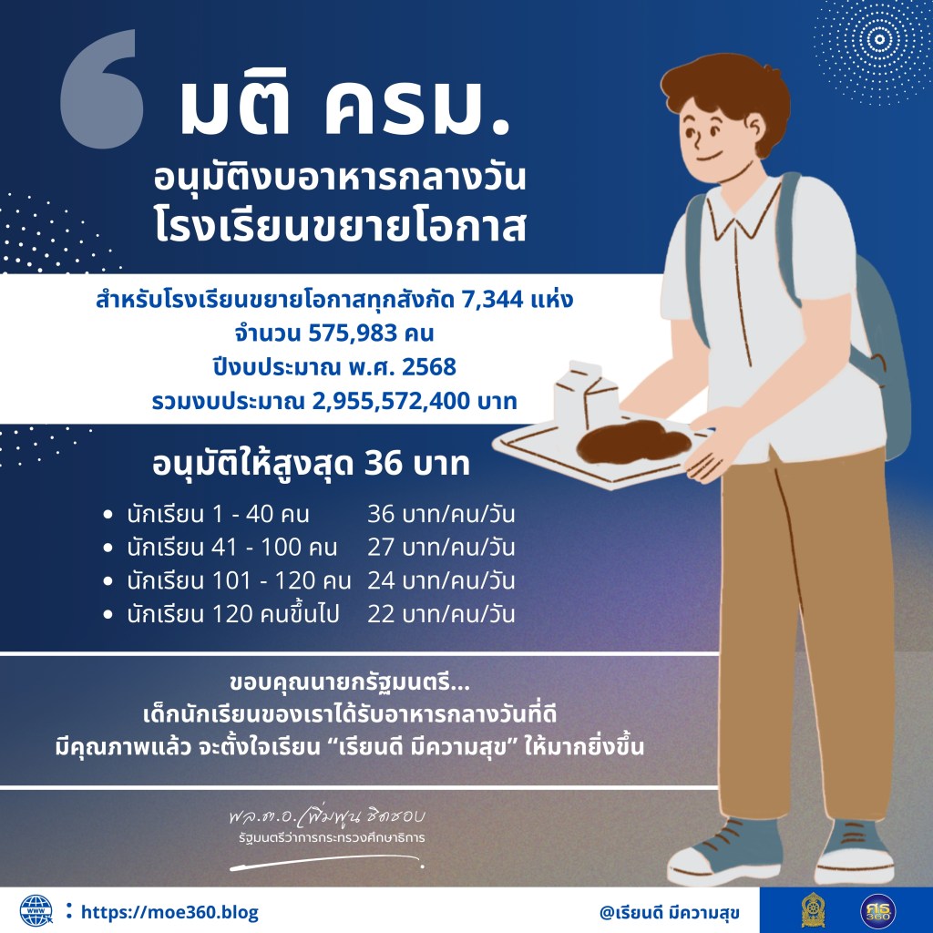 26 มีนาคม 2567 : พล.ต.อ.เพิ่มพูน ชิดชอบ รัฐมนตรีว่าการกระทรวงศึกษาธิการ เปิดเผยผลการประชุมคณะรัฐมนตรี (ครม.) ในประเด็นที่เกี่ยวข้องกับกระทรวงศึกษาธิการว่า ครม. มีมติเห็นชอบในหลักการอนุมัติงบประมาณอุดหนุนค่าอาหารกลางวันของนักเรียนระดับมัธยมศึกษาปีที่ 1 – 3 ของโรงเรียนขยายโอกาส สำหรับโรงเรียนในสังกัดสำนักงานคณะกรรมการการศึกษาขั้นพื้นฐาน กรมส่งเสริมการปกครองท้องถิ่น กองบัญชาการตำรวจตระเวนชายแดน และกรุงเทพมหานคร ระยะเวลา 200 วัน/ปีการศึกษา จำนวน 7,344 แห่ง จำนวนนักเรียนทั้งสิ้น 575,983 คน รวมงบประมาณทั้งสิ้น 2,955.57 ล้านบาท โดยมีผลในปีงบประมาณ พ.ศ. 2568 โดยในกรณีโรงเรียนที่มีการจัดการเรียนการสอนตั้งแต่ระดับชั้นประถมศึกษาถึงระดับชั้นมัธยมศึกษาปีที่ 1 – 3 ขอให้คำนวณจำนวนนักเรียนของทั้งโรงเรียนเพื่อกำหนดเป็นขนาดของโรงเรียนในการประมาณการค่าอาหารกลางวัน