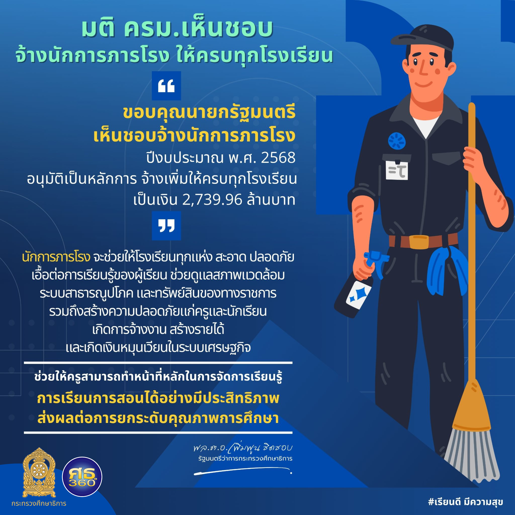 ที่ประชุม ครม. มีมติเห็นชอบในหลักการ จ้างนักการภารโรงให้ทุกโรงเรียน ในปีงบประมาณ พ.ศ. 2568 งบประมาณที่ใช้ 2,739.96 ล้านบาท โดยจ้างในอัตราเดือนละ 9,000 บาท โดยให้ สพฐ.จัดทำแผนการปฏิบัติงานและแผนการใช้จ่ายงบประมาณตามภารกิจ ความจำเป็นและเหมาะสม รวมถึงกำหนดมาตรการและแนวทางการบริหารจัดการงบประมาณที่มีอยู่อย่างคุ้มค่าและเกิดประโยชน์สูงสุด เพื่อเสนอขอตั้งงบประมาณรายจ่ายประจำปีตามขั้นตอนต่อไป