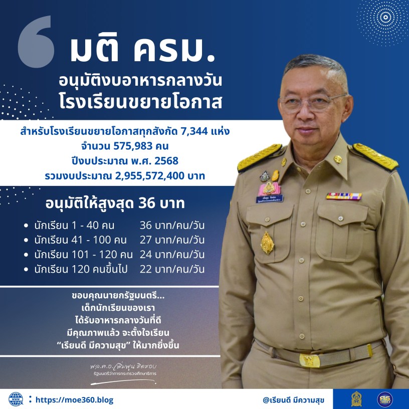 26 มีนาคม 2567 : พล.ต.อ.เพิ่มพูน ชิดชอบ รัฐมนตรีว่าการกระทรวงศึกษาธิการ เปิดเผยผลการประชุมคณะรัฐมนตรี (ครม.) ในประเด็นที่เกี่ยวข้องกับกระทรวงศึกษาธิการว่า ครม. มีมติเห็นชอบในหลักการอนุมัติงบประมาณอุดหนุนค่าอาหารกลางวันของนักเรียนระดับมัธยมศึกษาปีที่ 1 – 3 ของโรงเรียนขยายโอกาส สำหรับโรงเรียนในสังกัดสำนักงานคณะกรรมการการศึกษาขั้นพื้นฐาน กรมส่งเสริมการปกครองท้องถิ่น กองบัญชาการตำรวจตระเวนชายแดน และกรุงเทพมหานคร ระยะเวลา 200 วัน/ปีการศึกษา จำนวน 7,344 แห่ง จำนวนนักเรียนทั้งสิ้น 575,983 คน รวมงบประมาณทั้งสิ้น 2,955.57 ล้านบาท โดยมีผลในปีงบประมาณ พ.ศ. 2568 โดยในกรณีโรงเรียนที่มีการจัดการเรียนการสอนตั้งแต่ระดับชั้นประถมศึกษาถึงระดับชั้นมัธยมศึกษาปีที่ 1 – 3 ขอให้คำนวณจำนวนนักเรียนของทั้งโรงเรียนเพื่อกำหนดเป็นขนาดของโรงเรียนในการประมาณการค่าอาหารกลางวัน