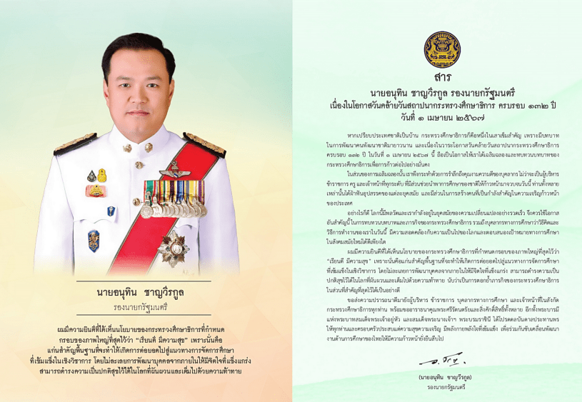 นายอนุทิน ชาญวีรกูล รองนายกรัฐมนตรี ซึ่งกำกับดูแลกระทรวงศึกษาธิการ มอบสารเนื่องในวันคล้ายวันสถาปนากระทรวงศึกษาธิการ ครบรอบ 132 ปี วันที่ 1 เมษายน 2567 สำหรับลงพิมพ์ในหนังสือที่ระลึกวันคล้ายวันสถาปนากระทรวงศึกษาธิการ ครบรอบ 132 ปี