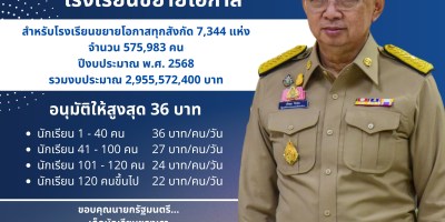 ครม.อนุมัติงบอาหารกลางวันให้นักเรียน ม.1-3 โรงเรียนขยายโอกาสทุกสังกัด 575,983 คน และเห็นชอบการจ้างนักการภารโรงให้ทุกโรงเรียนที่ขาด จำนวน 25,370 อัตรา