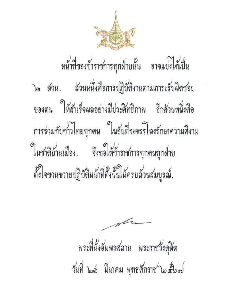 “หน้าที่ของข้าราชการทุกฝ่ายนั้น อาจแบ่งได้เป็น 2 ส่วน ส่วนหนึ่งคือการปฏิบัติงานตามภาระรับผิดชอบของตน ให้สำเร็จผลอย่างมีประสิทธิภาพ อีกส่วนหนึ่งคือ การร่วมกับชาวไทยทุกคน ในอันที่จะจรรโลงรักษาความดีงามในชาติบ้านเมือง จึงขอให้ข้าราชการทุกคนทุกฝ่าย ตั้งใจขวนขวายปฏิบัติหน้าที่ทั้งนั้นให้ครบถ้วนสมบูรณ์”