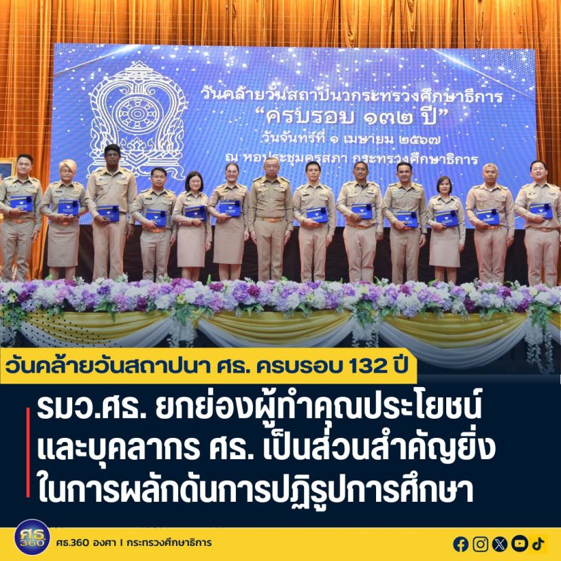 กระทรวงศึกษาธิการ (ศธ.) จัดงานวันคล้ายวันสถาปนาครบรอบ 132 ปี วันจันทร์ที่ 1 เมษายน 2567 รมว.ศธ. “เพิ่มพูน” กล่าวยกย่องผู้ทำคุณประโยชน์ ข้าราชการพลเรือนดีเด่น และบุคลากร ศธ. เป็นส่วนที่สำคัญยิ่งในการผลักดันการปฏิรูปการศึกษาร่วมกับ ศธ. พร้อมยกเป็นตัวอย่างที่เป็นรูปธรรมของการจับมือไว้แล้วไปด้วยกัน