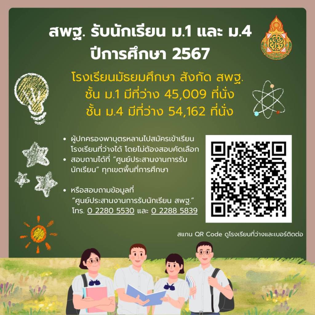 พร้อมกันนี้ ได้สั่งการให้รวบรวมรายชื่อโรงเรียนมัธยมศึกษาทั่วประเทศที่ยังมีที่นั่งว่างอยู่ โดยข้อมูล ณ วันที่ 5 เมษายน 2567 มีโรงเรียนมัธยมศึกษาในสังกัด สพฐ. ยังมีที่นั่งว่างสามารถรับนักเรียน ชั้น ม.1 ได้จำนวน 45,009 ที่นั่ง และชั้น ม.4 ได้จำนวน 54,162 ที่นั่ง โดยผู้ปกครองสามารถติดต่อสอบถามกับทางโรงเรียนได้โดยตรง และพาบุตรหลานไปสมัครเข้าเรียนกับทางโรงเรียนได้โดยไม่ต้องสอบคัดเลือก หรือติดต่อสอบถามข้อมูลเพิ่มเติมได้ที่ “ศูนย์ประสานงานการรับนักเรียน” ของทุกเขตพื้นที่การศึกษา ตามรายละเอียดและหมายเลขโทรศัพท์ ที่ปรากฏตามลิงก์นี้