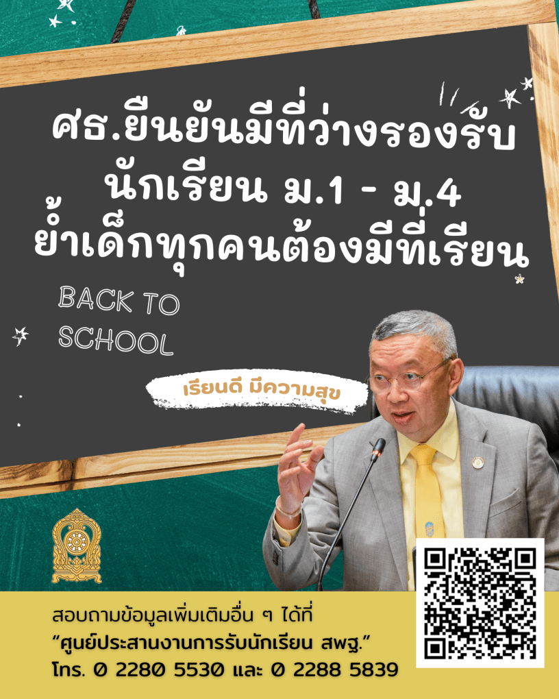 หรือสแกน QR CODE ตามที่ปรากฏ และสอบถามข้อมูลเพิ่มเติมอื่นๆ ได้ที่ “ศูนย์ประสานงานการรับนักเรียน สพฐ.” หมายเลขโทรศัพท์ 0 2280 5530 และ 0 2288 5839
