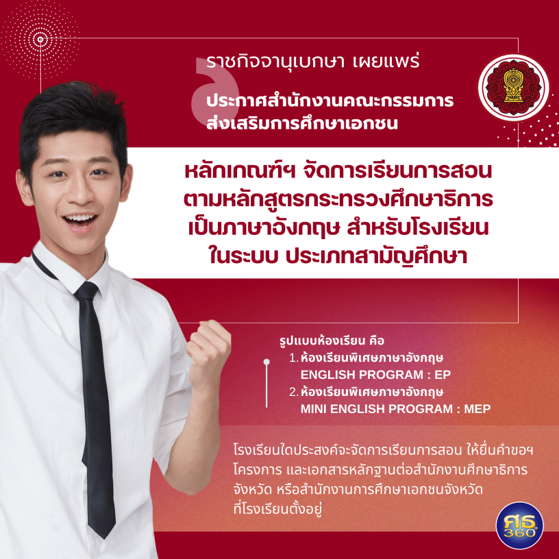 ราชกิจจานุเบกษา (5 เมษายน 2567) เผยแพร่ประกาศสำนักงานคณะกรรมการส่งเสริมการศึกษาเอกชน เรื่อง หลักเกณฑ์และวิธีการจัดการเรียนการสอนตามหลักสูตรกระทรวงศึกษาธิการเป็นภาษาอังกฤษ สำหรับโรงเรียนในระบบ ประเภทสามัญศึกษา