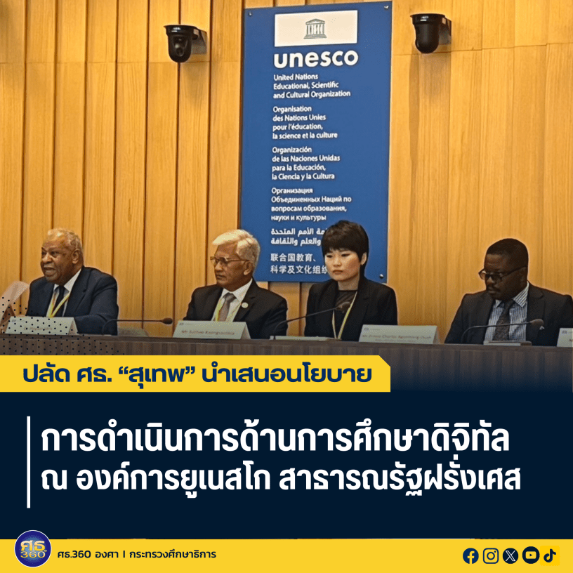 ปลัด ศธ. “สุเทพ แก่งสันเทียะ” นำเสนอนโยบายและการดำเนินการด้านการศึกษาดิจิทัล ณ องค์การยูเนสโก สาธารณรัฐฝรั่งเศส ย้ำต่อที่ประชุมถึงนโยบายสำคัญของ ศธ. ในการส่งเสริมการเรียนรู้ดิจิทัล และยุทธศาสตร์ 5 ข้อ ตามแผนปฏิบัติการดิจิทัลเพื่อการศึกษา คือ 1) พัฒนาโครงสร้างพื้นฐานดิจิทัล 2) สร้างโอกาส ความเสมอภาค ความเท่าเทียมทางการศึกษา 3) ก้าวสู่การเป็นหน่วยงานดิจิทัล 4) พัฒนากำลังคน 5) พัฒนาเทคโนโลยีดิจิทัลเพื่อการศึกษา