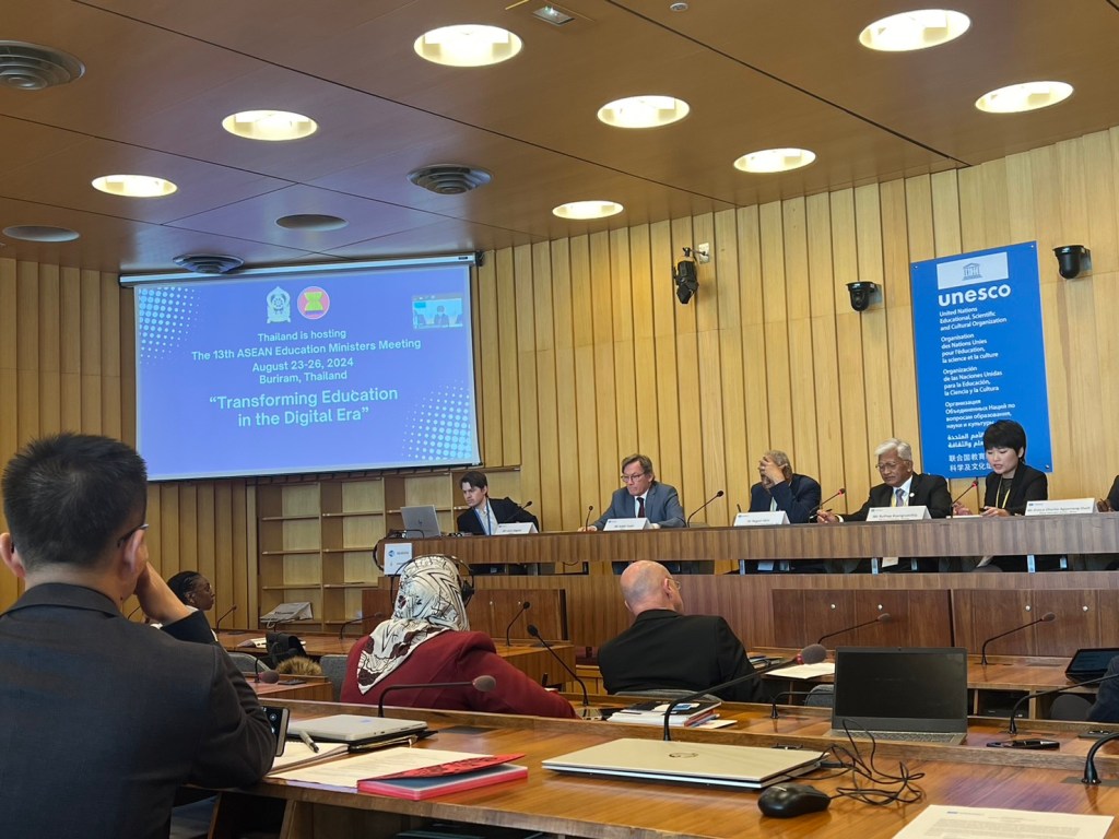 17 เมษายน 2567 ณ องค์การยูเนสโก กรุงปารีส สาธารณรัฐฝรั่งเศส / พลตำรวจเอก เพิ่มพูน ชิดชอบ รัฐมนตรีว่าการกระทรวงศึกษาธิการ มอบหมายให้ นายสุเทพ แก่งสันเทียะ ปลัดกระทรวงศึกษาธิการ และคณะ เข้าร่วมการนำเสนอนโยบายการบูรณาการด้านการเชื่อมต่อ เนื้อหาการเรียนรู้ และสมรรถนะด้านดิจิทัล เพื่อสนับสนุนการเรียนรู้ของประเทศไทย ในการประชุมโครงการ UNESCO-Huawei Funds-in-Trust on Technology-enabled Open Schools for All