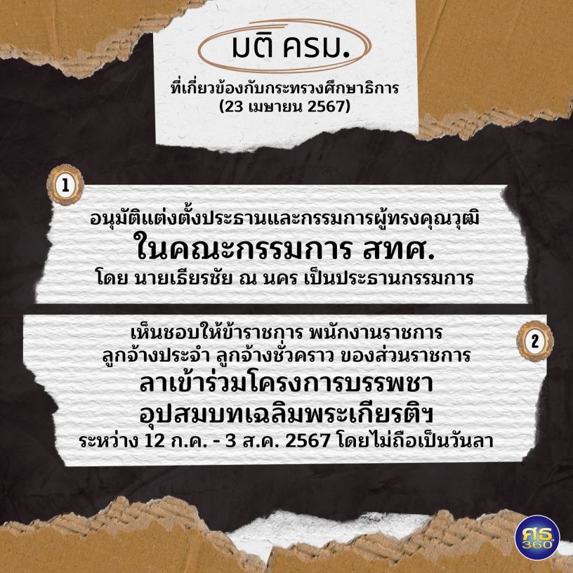 มติคณะรัฐมนตรี (23 เมษายน 2567) ที่เกี่ยวข้องกับกระทรวงศึกษาธิการ คือ อนุมัติแต่งตั้งประธานกรรมการและกรรมการผู้ทรงคุณวุฒิในคณะกรรมการสถาบันทดสอบทางการศึกษาแห่งชาติ (สทศ.) รวม 8 ราย และเห็นชอบให้ข้าราชการ พนักงานราชการ ลูกจ้างประจำ ลูกจ้างชั่วคราวของส่วนราชการ หน่วยงานของรัฐ และพนักงานรัฐวิสาหกิจ ลาเข้าร่วมโครงการบรรพชาอุปสมบทเฉลิมพระเกียรติพระบาทสมเด็จพระเจ้าอยู่หัว เนื่องในโอกาสพระราชพิธีมหามงคลเฉลิมพระชนมพรรษา 6 รอบ 28 กรกฎาคม 2567 โดยไม่ถือเป็นวันลา
