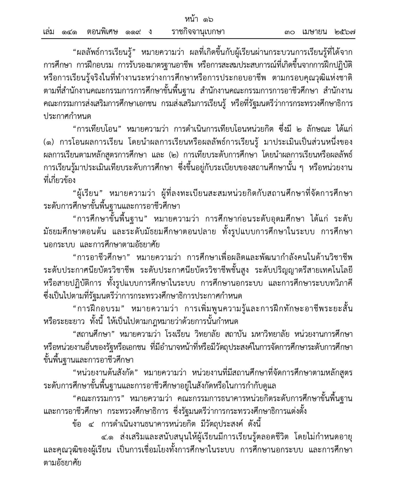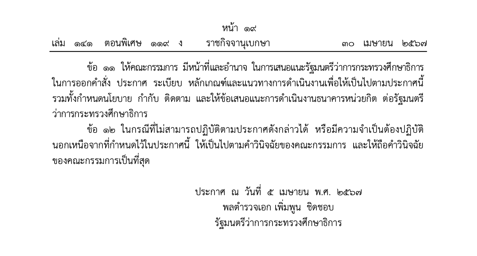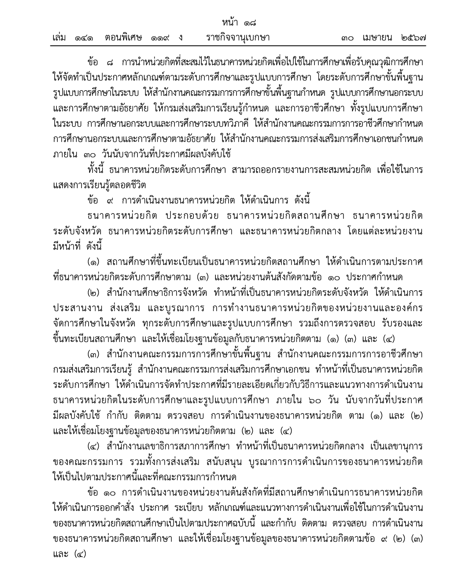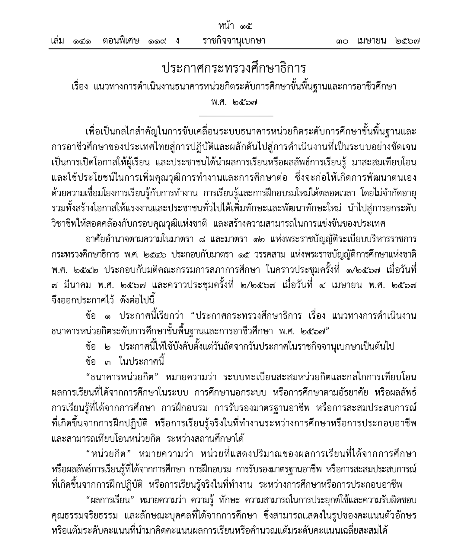 ราชกิจจานุเบกษา (30 เมษายน 2567) เผยแพร่ประกาศกระทรวงศึกษาธิการ เรื่อง แนวทางการดำเนินงานธนาคารหน่วยกิตระดับการศึกษาขั้นพื้นฐานและการอาชีวศึกษา ลงนามโดย พลตำรวจเอก เพิ่มพูน ชิดชอบ รัฐมนตรีว่าการกระทรวงศึกษาธิการ