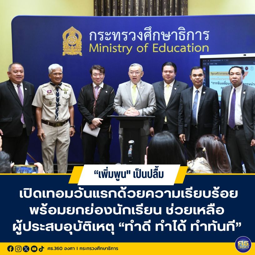 ภายหลังการประชุม รมว.ศธ. พร้อมด้วยนายสิริพงศ์ อังคสกุลเกียรติ ผช.รมต.ศธ. นายวิศรุต ปู่เพ็ง ที่ปรึกษา รมช.ศธ. นายสุเทพ แก่งสันเทียะ ปลัด ศธ. ว่าที่ร้อยตรี ธนุ วงษ์จินดา เลขาธิการ กพฐ. นายยศพล เวณุโกเศศ เลขาธิการ กอศ. และนายธนากร ดอนเหนือ อธิบดี สกร. แถลงข่าว ณ ห้องแถลงข่าว สรุปดังนี้