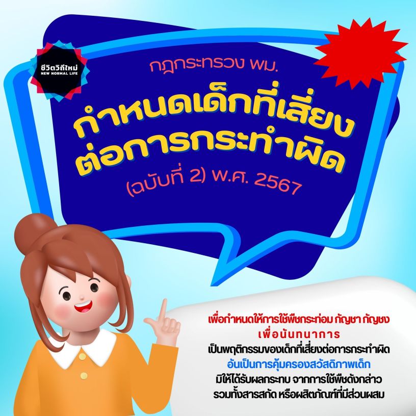 ราชกิจจานุเบกษา (24 พฤษภาคม 2567) เผยแพร่กฎกระทรวง กำหนดเด็กที่เสี่ยงต่อการกระทำผิด (ฉบับที่ 2) พ.ศ. 2567