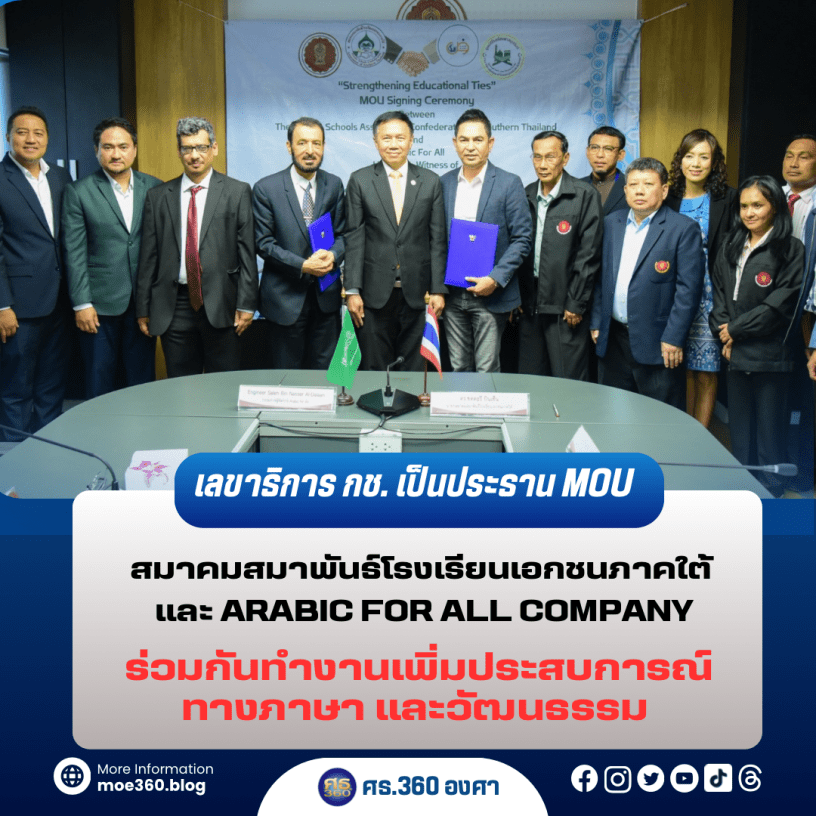 29 พฤษภาคม 2567 – นายมณฑล ภาคสุวรรณ์ เลขาธิการคณะกรรมการส่งเสริมการศึกษาเอกชน เป็นประธานในพิธีลงนามบันทึกความเข้าใจระหว่างสมาคมสมาพันธ์โรงเรียนเอกชนภาคใต้ กับ ศูนย์ผลิตหลักสูตรและตำราการสอนภาษาอาหรับให้แก่ชาวต่างชาติ Arabic For All Company ซึ่งเป็นผู้นำด้านการศึกษาและการสอนภาษาอาหรับในราชอาณาจักรซาอุดีอาระเบีย ณ ห้องประชุมวิเวก ปางพุฒิพงศ์ ชั้น 2 อาคารสำนักงานคณะกรรมการส่งเสริมการศึกษาเอกชน