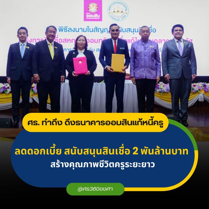 นอกจากนี้ยังมีพิธีลงนามในสัญญาสนับสนุนสินเชื่อ “โครงการสินเชื่อสหกรณ์ออมทรัพย์เพื่อแก้ไขหนี้บุคลากรภาครัฐ” ระหว่างธนาคารออมสิน กับสหกรณ์ออมทรัพย์ครูกาญจนบุรี จำกัด ซึ่งเป็นการให้สินเชื่อกับครูและบุคลากรทางการศึกษา จำนวน 2,000 ล้านบาท และลดดอกเบี้ยในอัตราร้อยละ 2.88 ต่อปี โดยเป็นการนำร่องที่จังหวัดกาญจนบุรีก่อน และจะขยายผลไปยังจังหวัดอื่นทั่วประเทศ ซึ่งต้องขอบคุณธนาคารออมสินที่ใส่ใจครูร่วมกัน เพราะข้าราชการครูและบุคลากรทางการศึกษาอาจมีหนี้สินหลายส่วนเป็นภาระต่อเนื่องมาระยะเวลานาน หากได้รับความร่วมมือที่ดีจากสถาบันทางการเงิน ก็จะสามารถแก้ไขปัญหาหนี้สินได้ตรงจุด แบ่งเบาภาระครู เกิดคุณภาพชีวิตที่ดีในระยะยาว และหากครูมีจิตใจที่เข้มแข็งที่จะแก้ไขหนี้สินของตัวเอง เชื่อว่าจะจัดการปัญหาหนี้สินได้อย่างมีประสิทธิภาพแน่นอน