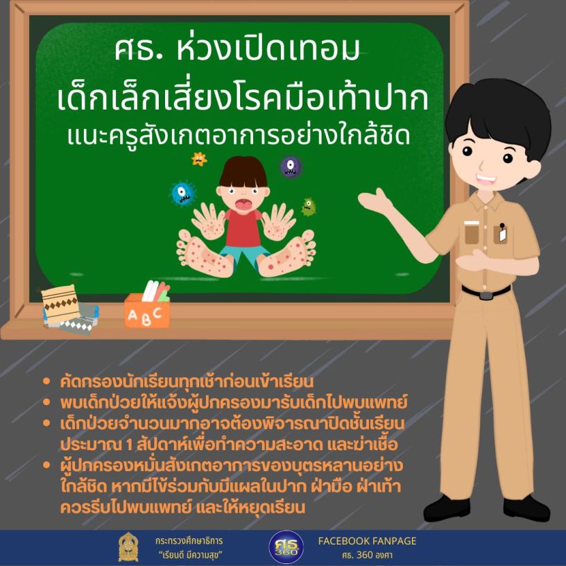 โฆษก ศธ. กล่าวว่า ในช่วงนี้นักเรียนเปิดเทอมหมดทุกโรงเรียนแล้ว แต่ละที่ก็มีการเรียนการสอนและกิจกรรมร่วมกันของเด็กนักเรียน การใกล้ชิดกันก็เป็นสาเหตุหนึ่งของโรคมือเท้าปาก ที่เกิดจากการติดเชื้อไวรัสชนิดหนึ่ง ซึ่งพบบ่อยในเด็กเล็ก มักเกิดในสถานที่ที่มีเด็กอยู่จำนวนมาก โดยมีอาการไข้ ปวดศีรษะ ปวดเมื่อยเนื้อตัว มีตุ่มพองขนาดเล็กขึ้นบริเวณฝ่ามือ ฝ่าเท้า ปาก ลิ้น สถานศึกษาจึงต้องมีมาตรการจัดการโรคระบาด เพื่อให้ผู้เรียนและผู้ปกครองอุ่นใจ