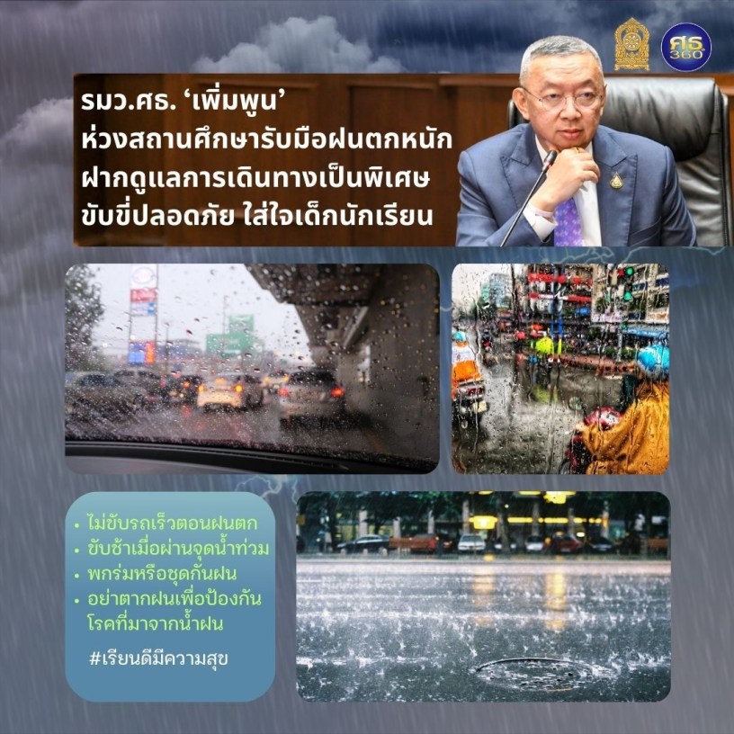 กระทรวงศึกษาธิการ อยากเน้นย้ำสถานศึกษาทุกพื้นที่ ดูแลความปลอดภัยของผู้เรียนให้ครอบคลุมทุกด้าน นอกจากเรื่องอุบัติเหตุแล้ว เรื่องสุขภาพของผู้เรียนก็ยังเป็นที่ห่วงใยไม่แพ้กัน เพราะช่วงหน้าฝนผู้เรียนอาจจะเป็นหวัดได้ง่าย รวมถึงโรคต่าง ๆ ที่มาพร้อมกับหน้าฝน หากป้องกันอาจป่วยจนส่งผลกระทบต่อการเรียน เพื่อความไม่ประมาทควรมีมาตรการรับมือและแจ้งเตือนพื้นที่เสี่ยง ให้ระมัดระวังอันตรายจากฝนตกหนัก และเตรียมสภาพรถให้พร้อมก่อนออกเดินทางเสมอ นอกจากการดูแลความปลอดภัยของผู้เรียนแล้ว ยังเป็นการเคารพกฎกติการ่วมกันในการใช้ท้องถนนอีกด้วย