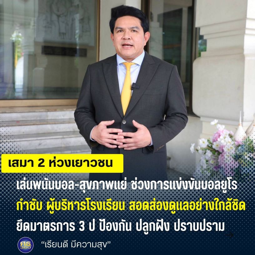 “การเล่นกีฬาช่วยทำให้สุขภาพร่างกายแข็งแรง ส่วนการดูกีฬาก็ช่วยเสริมสร้างทักษะให้เกิดการเรียนรู้ต่อยอดการทำงานร่วมกับผู้อื่น รู้จักน้ำใจนักกีฬา รู้แพ้ รู้ชนะ รู้อภัย ดังนั้นขอย้ำว่าการรับชมการแข่งขันฟุตบอลยูโรครั้งนี้ผู้บริหารรวมถึงครูและบุคลากรทางการศึกษาจะต้องช่วยกันสอดส่องดูแลไม่ให้มีการเล่นพนันในสถานศึกษาทุกรูปแบบ โดยเน้นย้ำตามหลักมาตรการ 3 ป (ป้องกัน ปลูกฝัง ปราบปราม) เพื่อให้สถานศึกษาดำเนินการป้องกันและแก้ไขปัญหาการเล่นพนันออนไลน์ ปลูกฝังคุณลักษณะการต่อต้านการเล่นการพนันออนไลน์ และปราบปรามไม่ให้มีการเล่นพนันออนไลน์ในนักเรียน ครู และบุคลากรทางการศึกษา ให้ได้ผลอย่างจริงจังและต่อเนื่อง”