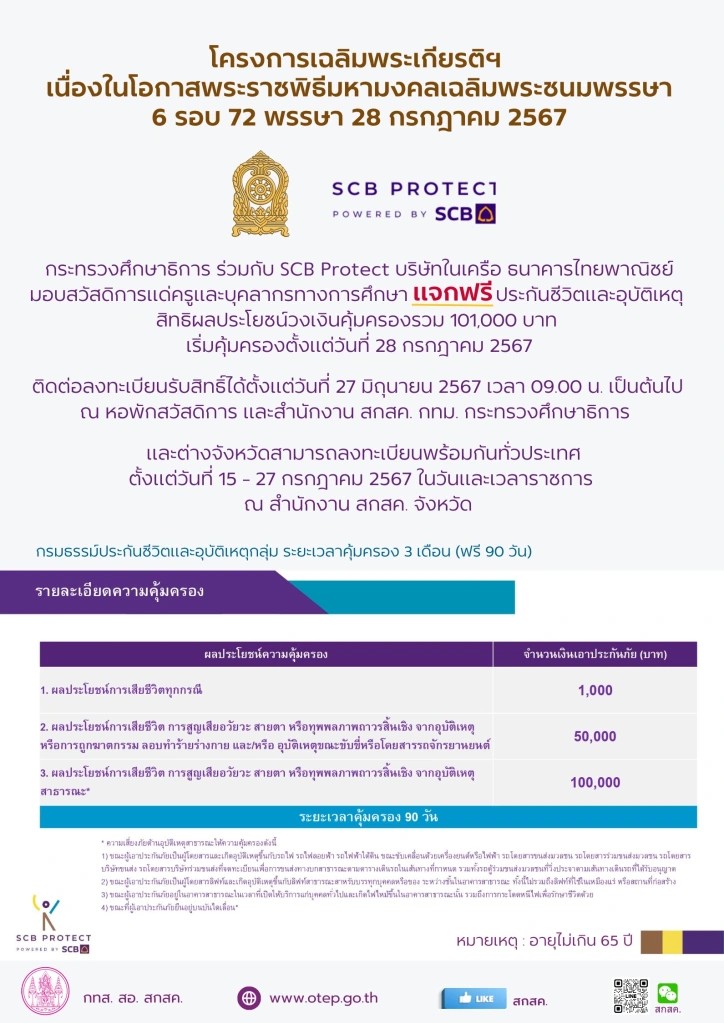 ทั้งนี้ สำนักงานคณะกรรมการส่งเสริมสวัสดิการและสวัสดิภาพครูและบุคลากรทางการศึกษา (สกสค.) เป็นหน่วยงานดูแลในเรื่องสวัสดิการ มีเพื่อนครูทุกสังกัดทั่วประเทศเป็นสมาชิก จะเป็นหลักในการดำเนินการ โดยสามารถลงทะเบียนได้ตั้งแต่วันนี้ ณ หอพักสวัสดิการ และสำนักงาน สกสค. และต่างจังหวัดสามารถลงทะเบียนพร้อมกันทั่วประเทศ ตั้งแต่วันที่ 15 – 27 กรกฎาคม 2567 ในวันและเวลาราชการ ณ สำนักงาน สกสค. จังหวัด เริ่มมีผลคุ้มครองตั้งแต่วันที่ 28 กรกฎาคม 2567 เป็นต้นไป จนถึง 90 วัน