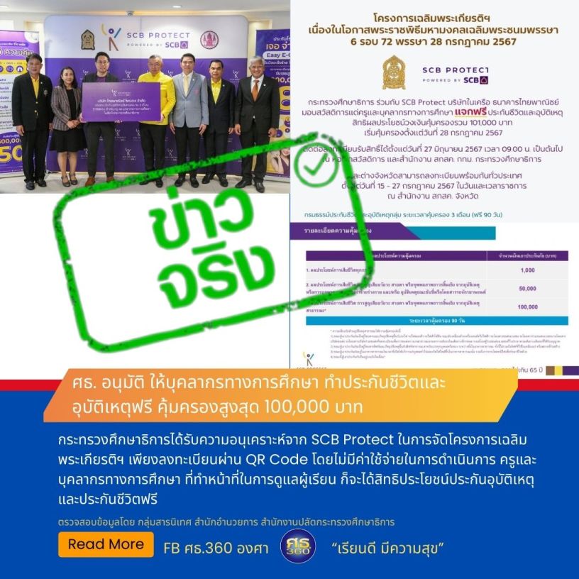 กลุ่มสารนิเทศ สำนักอำนวยการ สำนักงานปลัดกระทรวงศึกษาธิการ ได้ตรวจสอบแล้ว ยืนยันว่าเป็นข่าวจริง โดยเมื่อวันพฤหัสบดีที่ 27 มิถุนายน 2567 พลตำรวจเอก เพิ่มพูน ชิดชอบ รัฐมนตรีว่าการกระทรวงศึกษาธิการ (รมว.ศธ.) เป็นประธานเปิดโครงการความร่วมมือ ระหว่างกระทรวงศึกษาธิการ กับ SCB Protect บริษัทในเครือธนาคารไทยพาณิชย์ มอบสวัสดิการแด่ครูและบุคลากรทางการศึกษา ประกันชีวิตและอุบัติเหตุ สิทธิผลประโยชน์วงเงินคุ้มครองรวม 101,000 บาท โดยมี นายสุเทพ แก่งสันเทียะ ปลัด ศธ. ว่าที่ร้อยตรี ธนุวงษ์จินดา เลขาธิการ กพฐ. นายสราวุธ เพียรลุประสิทธิ์รองกรรมการผู้จัดการฝ่ายบริหารเทคโนโลยีสารสนเทศ บริษัท ไทยพาณิชย์ โพเทค ดร.พีระพันธ์ เหมะรัต เลขาธิการคณะกรรมการ สกสค. ผู้บริหารในสังกัด และในกำกับ เข้าร่วม ณ บริเวณล็อบบี้ ชั้น 1 หอพัก สกสค.