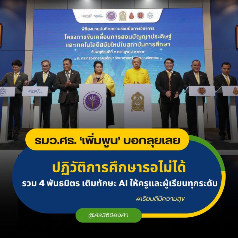 ลงนามบันทึกความร่วมมือทางวิชาการ “โครงการขับเคลื่อนการสอนปัญญาประดิษฐ์และเทคโนโลยีสมัยใหม่ในสถาบัน การศึกษา” เพื่อสร้างผู้สอน นักเรียนทุกคน ทุกช่วงชั้น ให้มีความรู้ด้าน AI มีความเข้าใจและตระหนัก เรื่องจริยธรรมของการนำไปใช้ประโยชน์ (ethical considerations) เตรียมพร้อมสู่การเป็นพลเมืองดิจิทัล และรองรับตลาดแรงงานสมัยใหม่แห่งศตวรรษที่ 21 โดยพลตำรวจเอก เพิ่มพูน ชิดชอบ รัฐมนตรีว่าการกระทรวงศึกษาธิการ (รมว.ศธ.) และ นางสาวศุภมาส อิศรภักดี รัฐมนตรีว่าการกระทรวงการอุดมศึกษา วิทยาศาสตร์ วิจัยและนวัตกรรม (รมว.อว.) ได้ร่วมเป็นสักขีพยาน