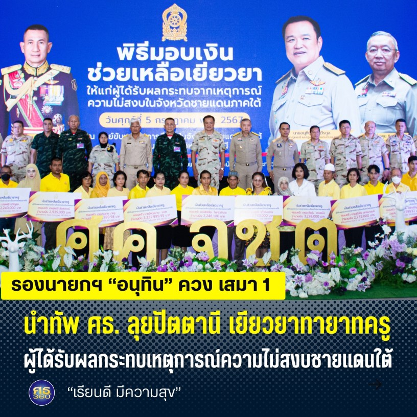 นายอนุทิน ชาญวีรกูล กล่าวว่า “ขอความสันติสุข จงบังเกิดมีแก่ทุกท่าน“ ในวันนี้กระทรวงศึกษาธิการได้มอบเงินช่วยเหลือเยียวยาให้แก่ผู้ได้รับผลกระทบจากเหตุการณ์ความไม่สงบในจังหวัดชายแดนภาคใต้ เพื่อเป็นการสร้างขวัญกำลังใจแก่ผู้ได้รับผลกระทบ สร้างโอกาสทางการศึกษา สามารถดำรงชีวิตอยู่ในสังคมทั้งปัจจุบันและอนาคตอย่างมีความสุข ทั้งนี้รัฐบาลภายใต้การนำของนายเศรษฐา ทวีสิน นายกรัฐมนตรี และ ศธ. ต้องขอบคุณ ทุกภาคส่วนที่เกี่ยวข้อง ที่ได้ดำเนินการช่วยเหลือเยียวยาทายาทครูผู้เสียชีวิตฯ