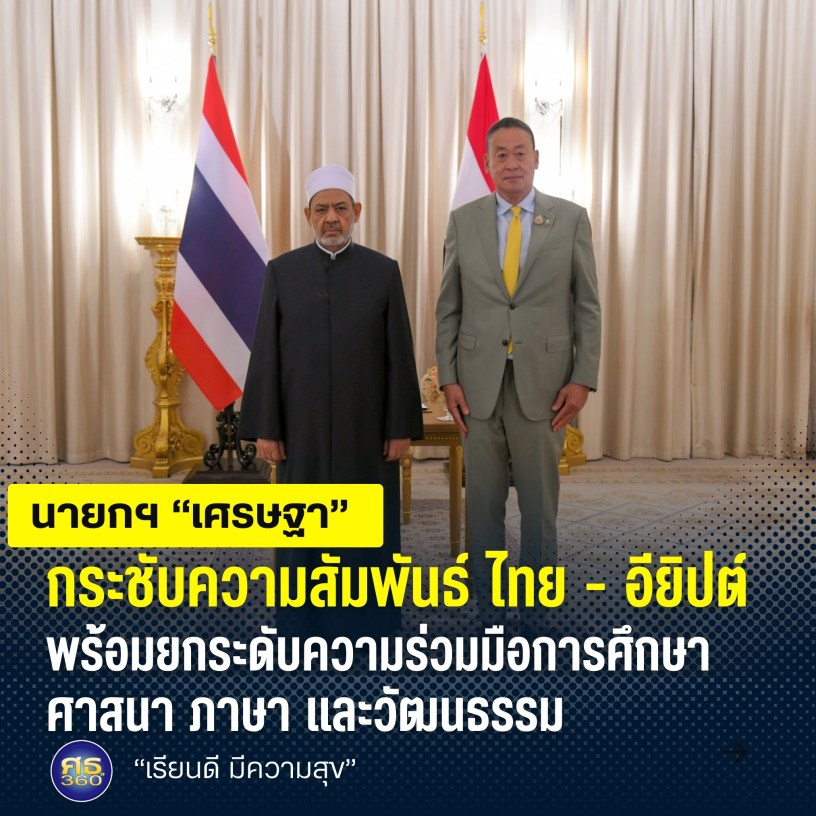 ทำเนียบรัฐบาล – 8 กรกฎาคม 2567 / นายสุเทพ แก่งสันเทียะ ปลัดกระทรวงศึกษาธิการ มอบหมายให้ นายพิเชฐ โพธิ์ภักดี รองปลัดกระทรวงศึกษาธิการ เข้าร่วมการหารือข้อราชการระหว่าง นายเศรษฐา ทวีสิน นายกรัฐมนตรี กับ ดร.อะห์เมด มุฮัมมัด อะห์เมด อัล-ฏอยยิบ (Professor Dr. Ahmed Mohamed Ahmed El-Tayeb) ผู้นำสูงสุดทางศาสนาอิสลามของสาธารณรัฐอาหรับอียิปต์ (Grand Imam Sheikh of Al-Azhar) ในการเยือนประเทศไทยอย่างเป็นทางการในฐานะแขกของรัฐบาล ณ ตึกไทยคู่ฟ้า