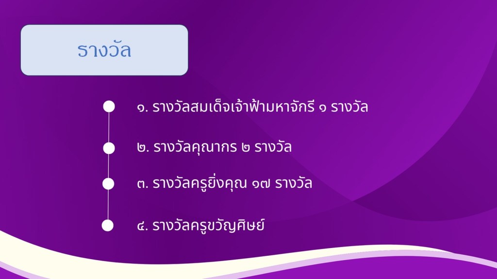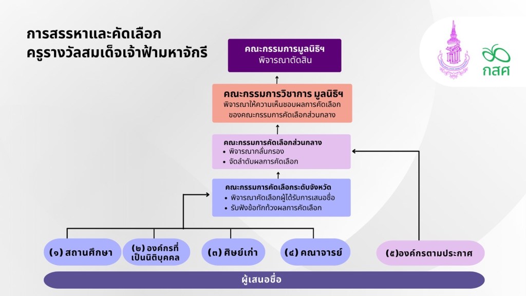 2. คณะกรรมการคัดเลือกส่วนกลาง จะพิจารณากลั่นกรองรายชื่อและศึกษาข้อมูลเชิงลึกและจัดลำดับ ผลการคัดเลือกฯ เสนอคณะกรรมการวิชาการ และคณะกรรมมูลนิธิฯ เพื่อพิจารณาตัดสิน “รางวัลสมเด็จเจ้าฟ้ามหาจักรี” รางวัลคุณากร รางวัลครูยิ่งคุณ และรางวัลครูขวัญศิษย์