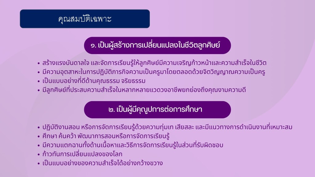 ปฏิบัติงานสอนหรือการจัดการเรียนรู้ ค้นคว้า พัฒนาการสอนหรือการเรียนรู้ด้วยความทุ่มเท เสียสละ มีความแตกฉานทั้งในเนื้อหาและวิธีการจัดการเรียนรู้ในส่วนที่รับผิดชอบ เป็นแบบอย่างของความสำเร็จได้อย่างกว้างขวาง
