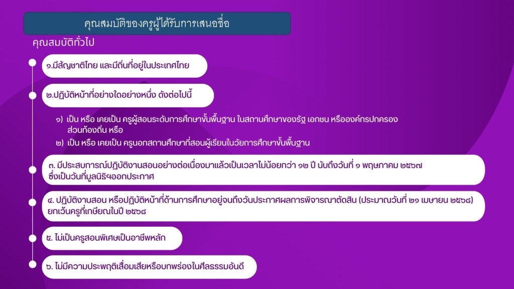 3. มีประสบการณ์ปฏิบัติงานสอนอย่างต่อเนื่องมาแล้วเป็นเวลาไม่น้อยกว่า 12 ปีนับถึงวันที่ออกประกาศ4. ปฏิบัติงานสอนอยู่จนถึงวันประกาศผลการพิจารณาตัดสิน ในกรณีที่เป็นผู้บริหาร สถานศึกษาต้องมีชั่วโมงสอนในรายวิชาอย่างต่อเนื่อง