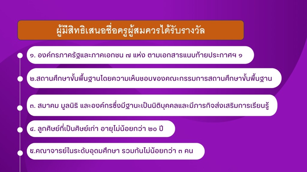 5. คณาจารย์ในระดับอุดมศึกษา รวมกันไม่น้อยกว่า 3 คน มีสิทธิ์เสนอชื่อลูกศิษย์ที่เคยสอนได้ 1 คน