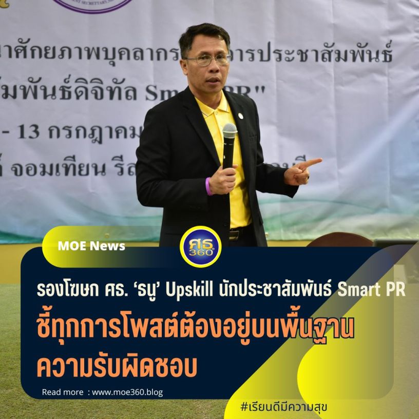 11 กรกฎาคม 2567/นายธนู ขวัญเดช รองปลัดกระทรวงศึกษาธิการ และรองโฆษกกระทรวงศึกษาธิการ เป็นวิทยากรบรรยายพิเศษ หัวข้อ “คุณธรรม จริยธรรม และกฎหมายที่เกี่ยวข้องกับการประชาสัมพันธ์” ในโครงการอบรมเชิงปฏิบัติการเพื่อพัฒนาศักยภาพบุคลากรด้านการประชาสัมพันธ์หลักสูตร “นักประชาสัมพันธ์ดิจิทัล Smart PR” ระหว่างวันที่ 11 – 13 กรกฎาคม 2567 ณ โรงแรมพินนาเคิล แกรนด์ จอมเทียน รีสอร์ท จังหวัดชลบุรี