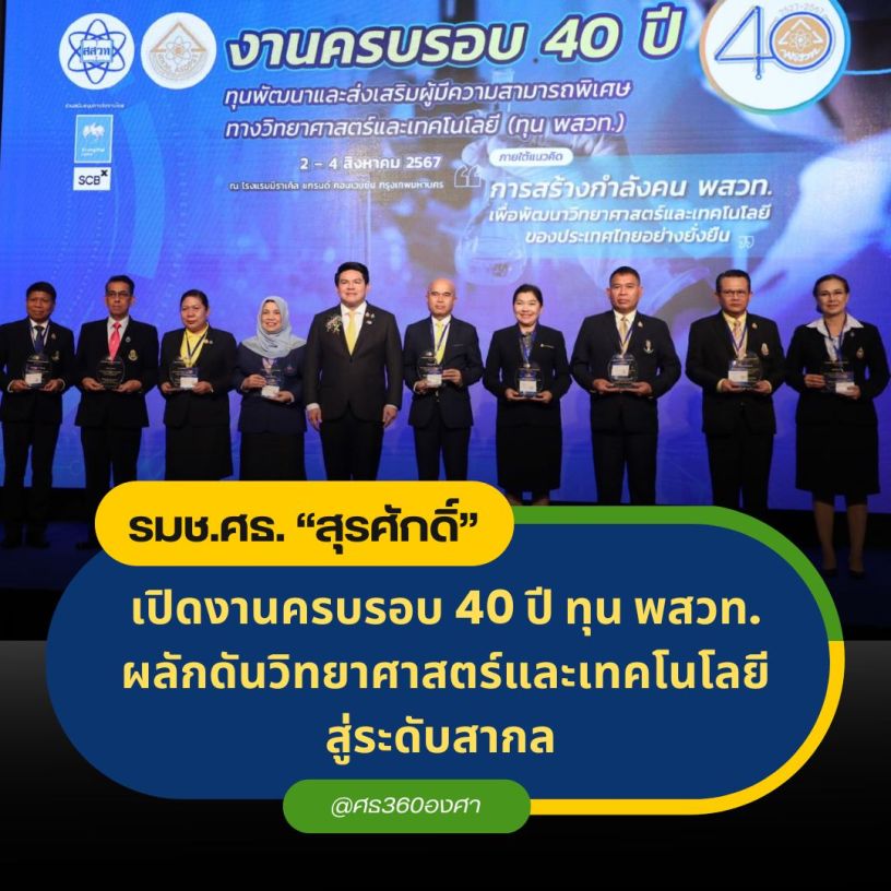 2 สิงหาคม 2567/ นายสุรศักดิ์ พันธ์เจริญวรกุล รัฐมนตรีช่วยว่าการกระทรวงศึกษาธิการ เป็นประธานเปิดงานครบรอบ 40 ปี ทุนพัฒนาและส่งเสริมผู้มีความสามารถพิเศษทางวิทยาศาสตร์และเทคโนโลยี (ทุน พสวท.) ณ โรงแรมมิราเคิล แกรนด์ คอนเวนชั่น กรุงเทพฯ พร้อมมอบ โล่เกียรติคุณ ต่อผู้ทำคุณประโยชน์แก่สถาบันส่งเสริมการสอนวิทยาศาสตร์และเทคโนโลยี (สสวท.) และทุน พสวท.และมอบเสื้อ พสวท.โดยมี ศ.ดร.ศุภชัย ปทุมนากุล รองปลัดกระทรวงการอุดมศึกษา วิทยาศาสตร์ วิจัยและนวัตกรรม ศ.ดร.ประสาท สืบค้า ประธานกรรมการสถาบันส่งเสริมการสอนวิทยาศาสตร์และเทคโนโลยี รศ.ดร.ธีระเดช เจียรสุขสกุล ผอ.สถาบันส่งเสริมการสอนวิทยาศาสตร์และเทคโนโลยี ผู้ทรงคุณวุฒิ ผู้บริหาร แขกผู้มีเกียรติ คณะผู้จัดการประชุม นักเรียน นิสิต และนักศึกษา ร่วมให้การต้อนรับ