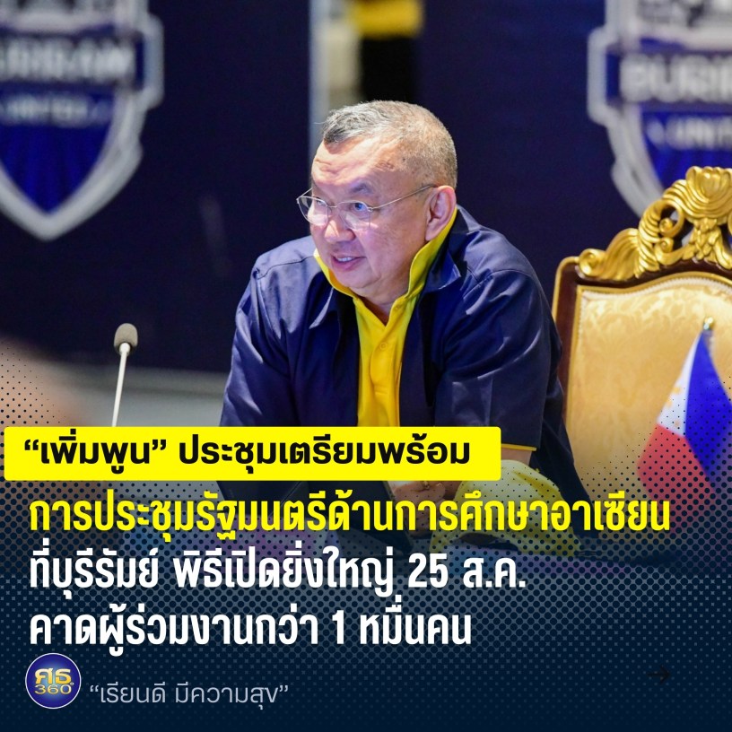 17 สิงหาคม 2567, จังหวัดบุรีรัมย์ / พลตำรวจเอก เพิ่มพูน ชิดชอบ รัฐมนตรีว่าการกระทรวงศึกษาธิการ นำทัพผู้บริหารกระทรวงศึกษาธิการ และหน่วยงานที่เกี่ยวข้อง ลงพื้นที่บุรีรัมย์ ประชุมคณะกรรมการอำนวยการดำเนินการจัดการประชุมรัฐมนตรีด้านการศึกษาอาเซียน ครั้งที่ 13 และการประชุมที่เกี่ยวข้อง ครั้งสุดท้ายก่อนจัดงานจริง ณ ห้องบอลลูม ชั้น 2 ช้างอารีนา