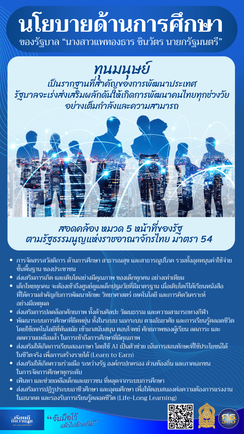 นโยบายด้านการศึกษาของรัฐบาล “นางสาวแพทองธาร ชินวัตร นายกรัฐมนตรี” ให้ความสำคัญในเรื่อง “ทุนมนุษย์” เป็นรากฐานที่สำคัญของการพัฒนาประเทศ รัฐบาลจะเร่งส่งเสริมผลักดันให้เกิดการพัฒนาคนไทยทุกช่วงวัยอย่างเต็มกำลังและความสามารถ
