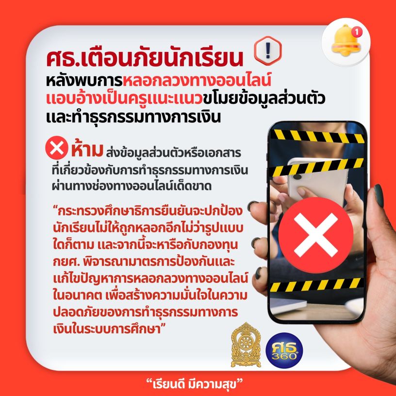 โฆษกกระทรวงศึกษาธิการได้เปิดเผยว่า รัฐมนตรีว่าการกระทรวงศึกษาธิการ พล.ต.อ.เพิ่มพูน ชิดชอบ และรัฐมนตรีช่วยว่าการกระทรวงศึกษาธิการ นายสุรศักดิ์ พันธ์เจริญวรกุล ให้ความสำคัญกับความปลอดภัยของนักเรียนในทุกมิติ ไม่ว่าจะเป็นความปลอดภัยในโลกจริงหรือโลกออนไลน์ รวมทั้งตระหนักถึงความเสี่ยงที่อาจเกิดขึ้นกับนักเรียนและครูแนะแนวจากการถูกแอบอ้างโดยมิจฉาชีพที่แฝงตัวมาในรูปแบบต่าง ๆ จึงขอความร่วมมือให้ผู้ปกครอง นักเรียน และครู ปฏิบัติตามหลักป้องกันภัยออนไลน์ อย่างเคร่งครัด ดังนี้