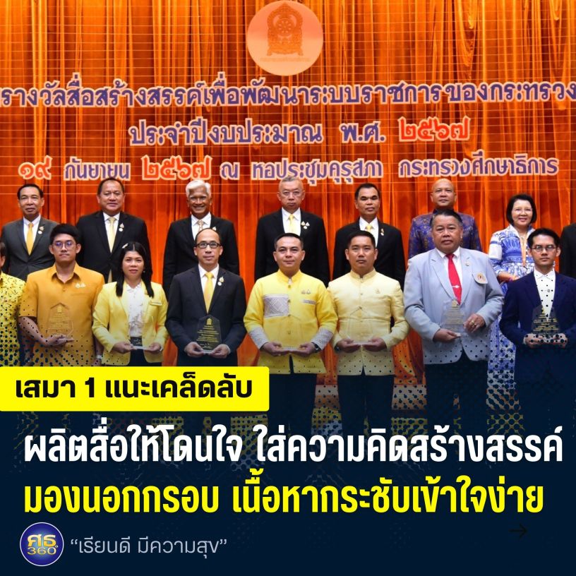 จากนั้น รมว.ศธ. ได้ให้เกียรติมอบโล่และเกียรติบัตรรางวัลสื่อสร้างสรรค์เพื่อพัฒนาระบบราชการของกระทรวงศึกษาธิการ ประจำปีงบประมาณ พ.ศ. 2567 รวม 2 ประเภทรางวัล ประกอบด้วย รางวัลนวัตกรรมการทำงานและยกระดับการให้บริการ จำนวน 27 รางวัล รางวัลชนะเลิศ ได้แก่ผลงาน “สพม.เชียงราย บริการคลิกเดียวจบ ครบทุกความต้องการ” โดย สำนักงานเขตพื้นที่การศึกษามัธยมเชียงราย สังกัด สพฐ. และรางวัลแนวปฏิบัติที่ดีในการดำเนินงานตามนโยบายของกระทรวงศึกษาธิการ จำนวน 19 รางวัล รางวัลชนะเลิศ ได้แก่ผลงาน “อาชีวะเรียนดีมีความสุข” โดย วิทยาลัยเทคนิคจันทบุรี สังกัด สอศ.