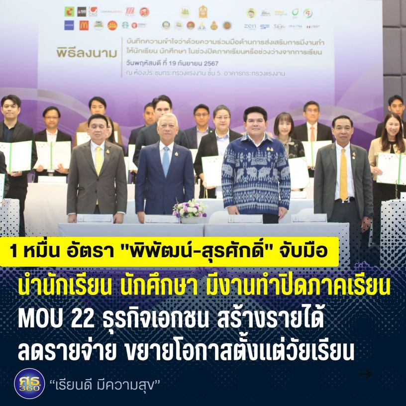 19 กันยายน 2567 / นายพิพัฒน์ รัชกิจประการ รัฐมนตรีว่าการกระทรวงแรงงาน และนายสุรศักดิ์ พันธ์เจริญวรกุล รัฐมนตรีช่วยว่าการกระทรวงศึกษาธิการ เป็นประธานในพิธีลงนามบันทึกความเข้าใจว่าด้วยความร่วมมือด้านการส่งเสริมการมีงานทำให้นักเรียน นักศึกษา ช่วงปิดภาคเรียน โดยมีนายสมชาย มรกตศรีวรรณ อธิบดีกรมการจัดหางาน กล่าวรายงาน นายไพโรจน์ โชติกเสถียร ปลัดกระทรวงแรงงาน นายธนากร ดอนเหนือ อธิบดีกรมส่งเสริมการเรียนรู้ ศธ. พร้อมด้วย ผู้บริหารระดับสูง กระทรวงแรงงาน ร่วมเป็นเกียรติในงาน ผู้บริหารจากหน่วยงานในสังกัดกระทรวงแรงงาน ผู้แทนจากกระทรวงศึกษาธิการ และผู้แทนจากสถานประกอบ 22 แห่ง ร่วมลงนาม ณ ห้องประชุม ชั้น 5 กระทรวงแรงงาน