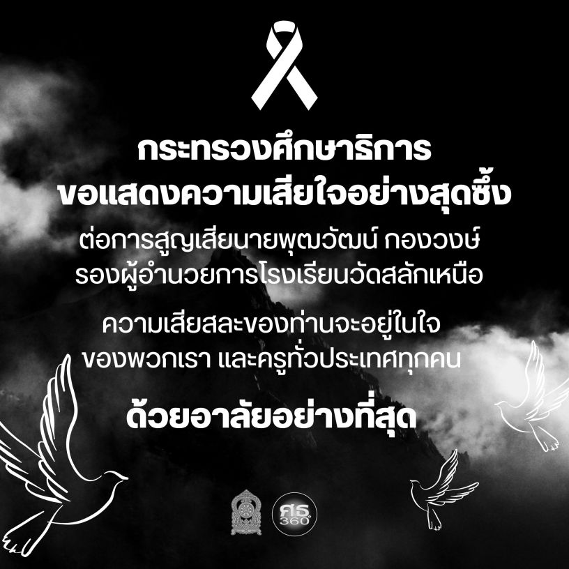 25 กันยายน 2567 – พลตำรวจเอก เพิ่มพูน ชิดชอบ รัฐมนตรีว่าการกระทรวงศึกษาธิการ ได้แสดงความเสียใจอย่างสุดซึ้งต่อครอบครัวและแวดวงการศึกษา จากการสูญเสียนายพุฒวัฒน์ กองวงษ์ รองผู้อำนวยการโรงเรียนวัดสลักเหนือ รักษาราชการแทนผู้อำนวยการโรงเรียนวัดแดง (นนทคุณพิพัฒน์ราษฎร์อุปถัมภ์) ต.ไทรม้า อ.เมืองนนทบุรี จ.นนทบุรี หลังท่านประสบอุบัติเหตุพลัดตกจากหลังคาอาคารเรียนเมื่อวันที่ 22 กันยายน 2567 ขณะปีนขึ้นไปซ่อมหลังคาที่ถูกพายุฝนถล่มอย่างรุนแรงจนเกิดช่องโหว่บนอาคารเรียน หลังจากฝนตกหนักต่อเนื่องทำให้หลังคาหลุดออกบางส่วน