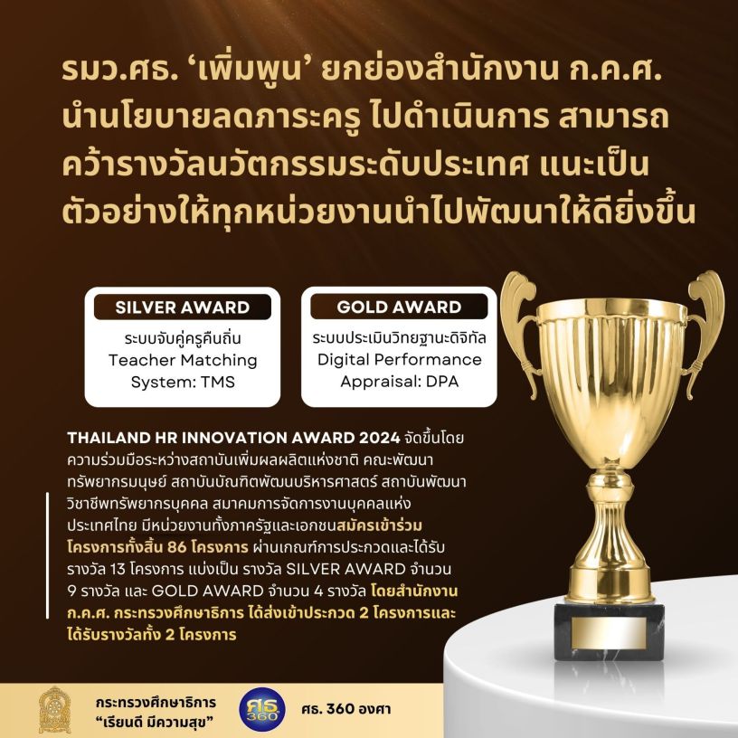 สำหรับโครงการรางวัลนวัตกรรมการบริหารและพัฒนาทรัพยากรมนุษย์ ประจำปี พ.ศ. 2567 (THAILAND HR INNOVATION AWARD 2024) จัดขึ้นโดยความร่วมมือระหว่างสถาบันเพิ่มผลผลิตแห่งชาติ (FTPI) คณะพัฒนาทรัพยากรมนุษย์ สถาบันบัณฑิตพัฒนบริหารศาสตร์ (HROD-NIDA) สถาบันพัฒนาวิชาชีพทรัพยากรบุคคล (IHPD) สมาคมการจัดการงานบุคคลแห่งประเทศไทย (PMAT) มีหน่วยงานทั้งภาครัฐและเอกชนสมัครเข้าร่วมโครงการทั้งสิ้น 86 โครงการ ผ่านเกณฑ์การประกวดและได้รับรางวัล 13 โครงการ แบ่งเป็น รางวัล SILVER AWARD จำนวน 9 รางวัล และ GOLD AWARD จำนวน 4 รางวัล โดยสำนักงาน ก.ค.ศ. กระทรวงศึกษาธิการ ได้ส่งเข้าประกวด 2 โครงการและได้รับรางวัลทั้ง 2 โครงการ ได้แก่
